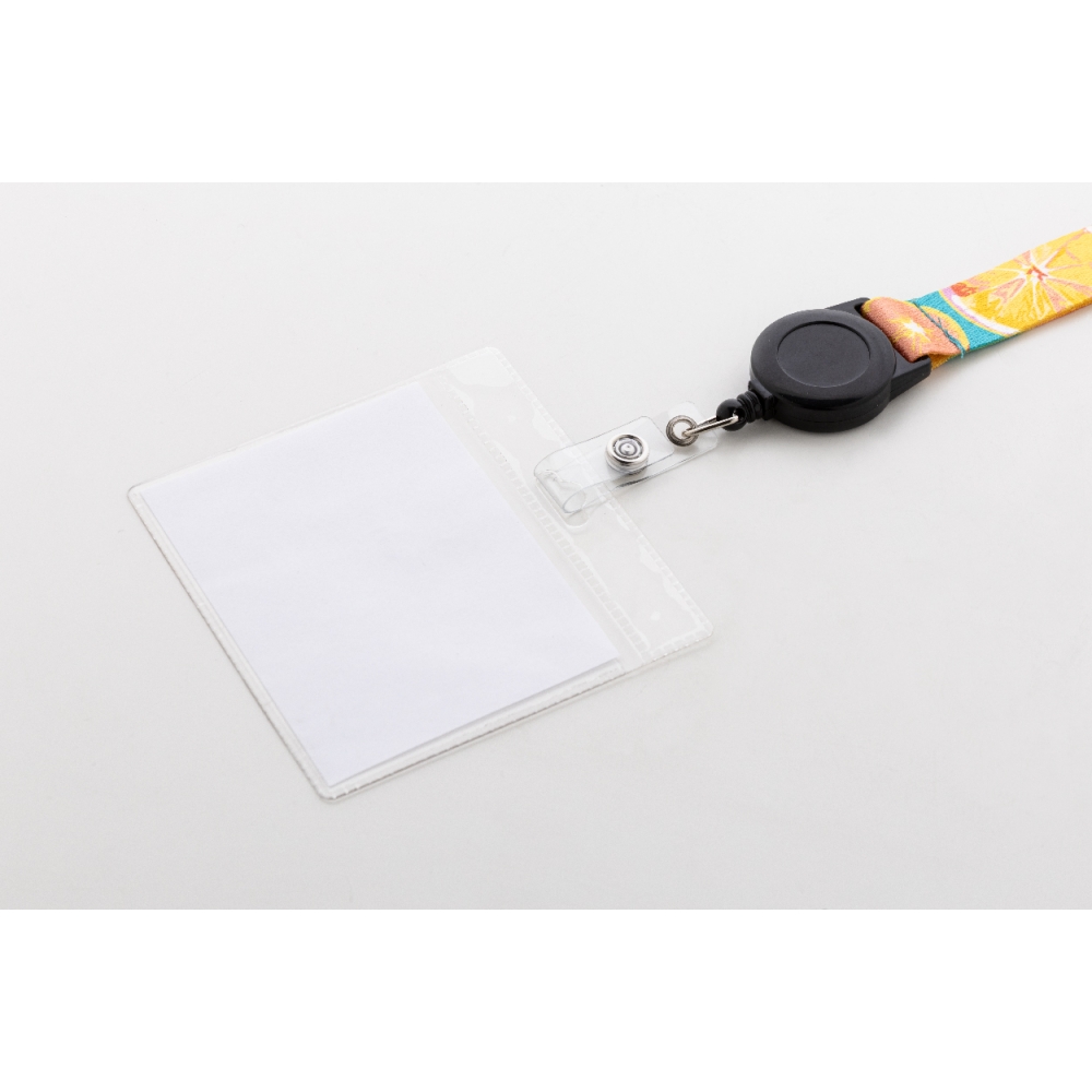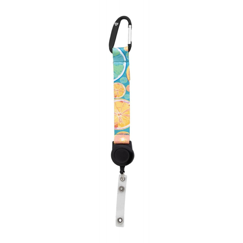 Individueller Schlüsselanhänger aus RPET-Polyester mit ausziehbarem Ausweishalter, Aluminiumkarabiner und Schlüsselring aus Metall. Preis inkl. Sublimationsdruck auf beiden Seiten sowie RPET-Label. Mindestmenge: 100 Stk.