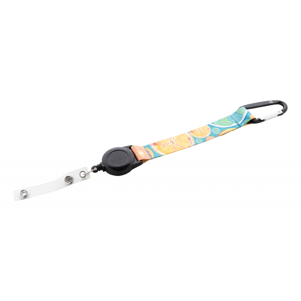 Schlicht gestalteter, ausziehbarer Gegenstandshalter mit Knopfverschlussriemen und Ausziehmechanismus bis zu 65 cm. Einschließlich eines Metallkarabiners und speziell entworfen, um alltägliche Objekte zu tragen und leichten Zugang zu ihnen zu erhalten (berührungssichere Schlüsselanhänger, Sicherheitszeiger, Ausweis...). Große Markierungsfläche auf dem Mittelstück.