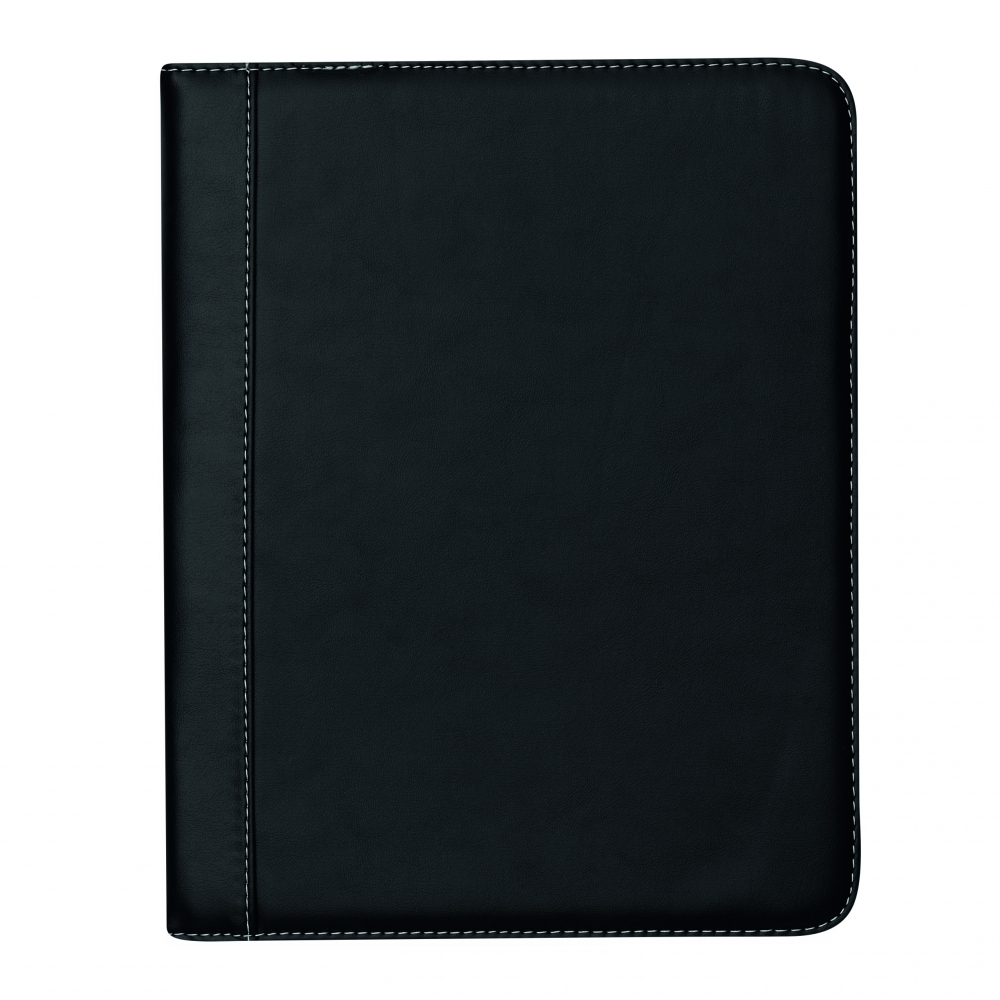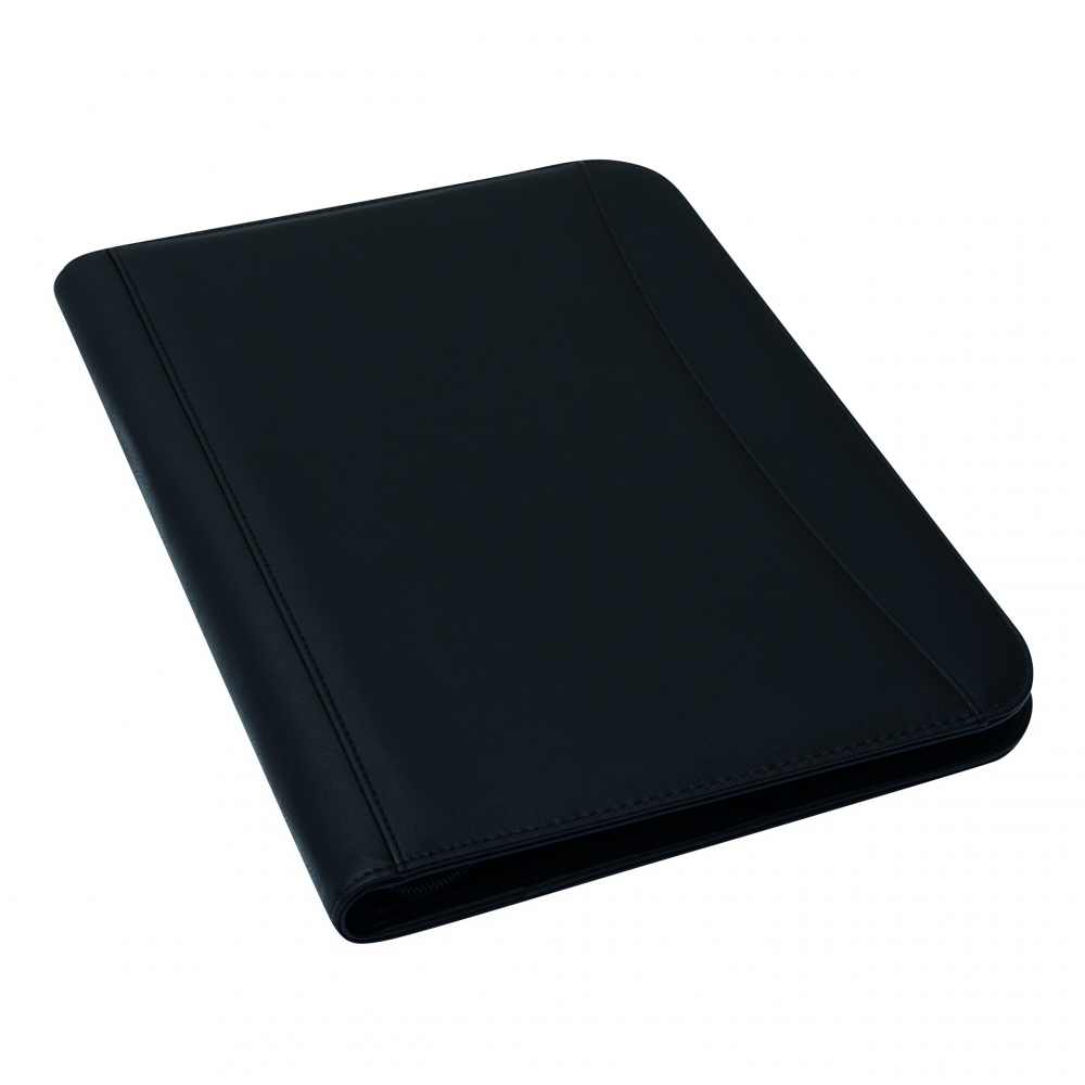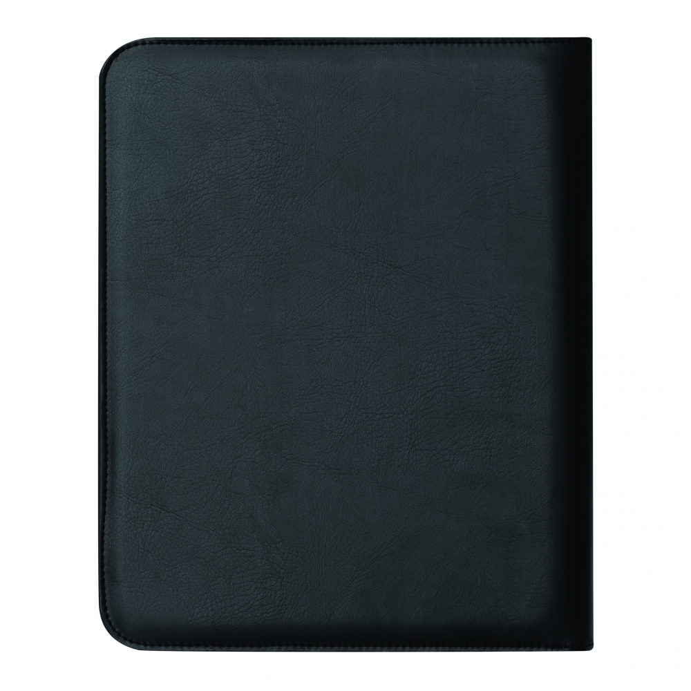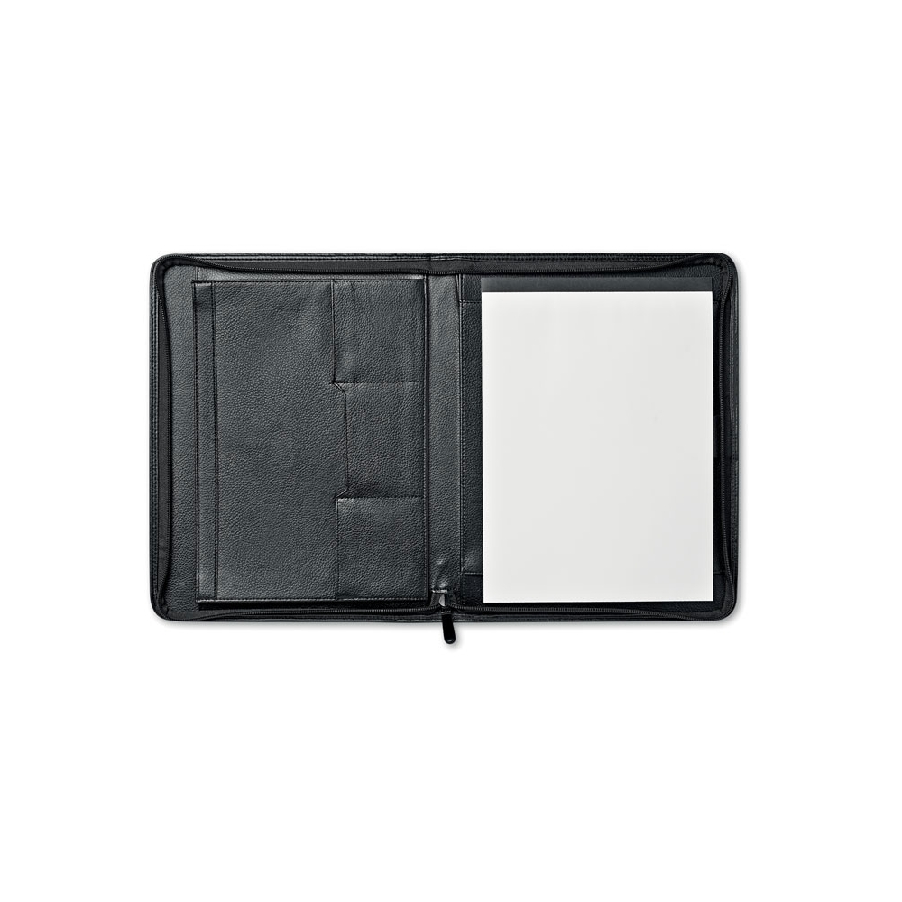 Schreibmappe / Dokumentenmapp aus 600D Polyester / Lederimitat im DIN A4-Format. Mit geräumigen Einsteckfächern, extra Einsteckfach an der Rückseite und Rundum-Reißverschluss. Inkl. Schreibblock und Kugelschreiber.