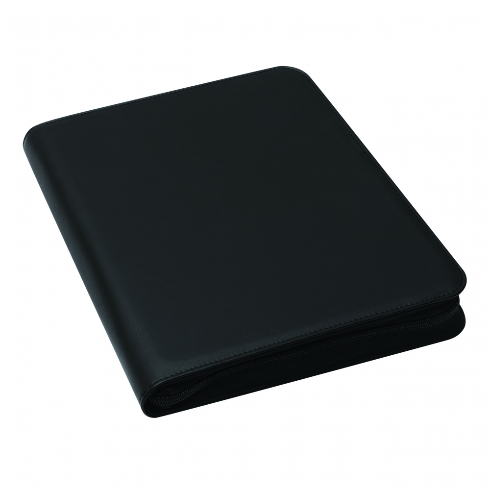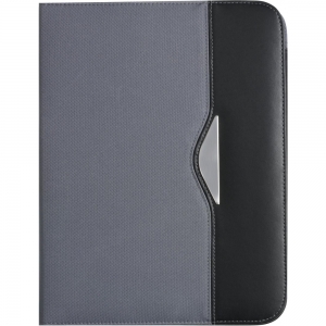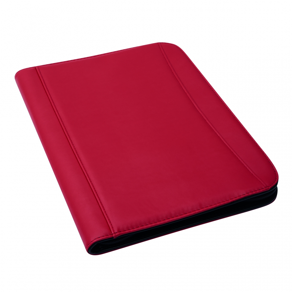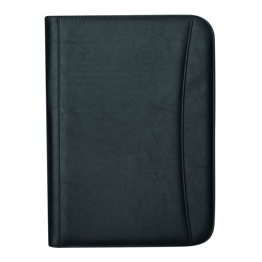 Schreibmappe / Dokumentenmapp aus 600D Polyester / Lederimitat im DIN A4-Format. Mit geräumigen Einsteckfächern, extra Einsteckfach an der Rückseite und Rundum-Reißverschluss. Inkl. Schreibblock und Kugelschreiber.