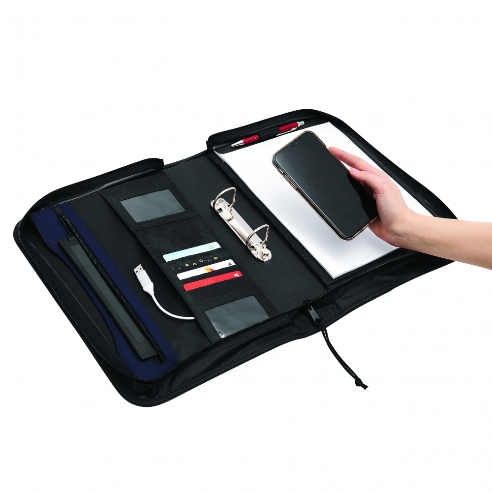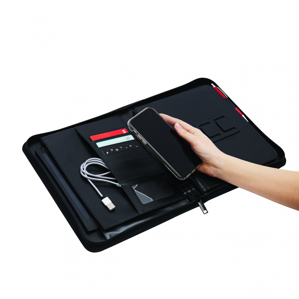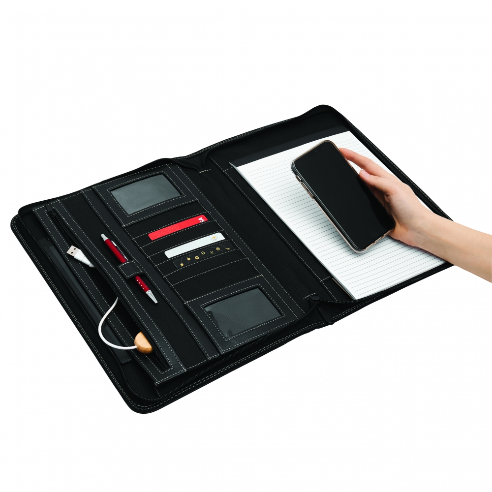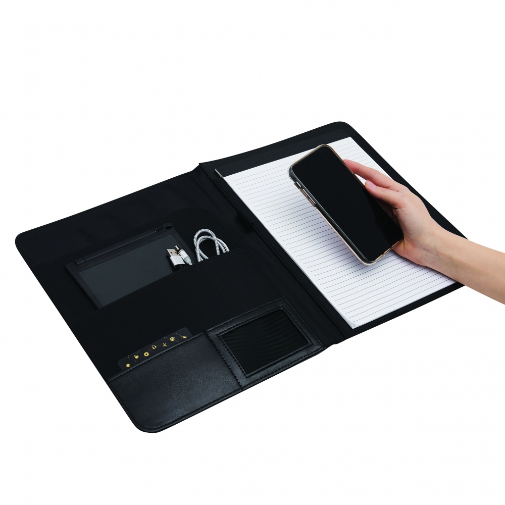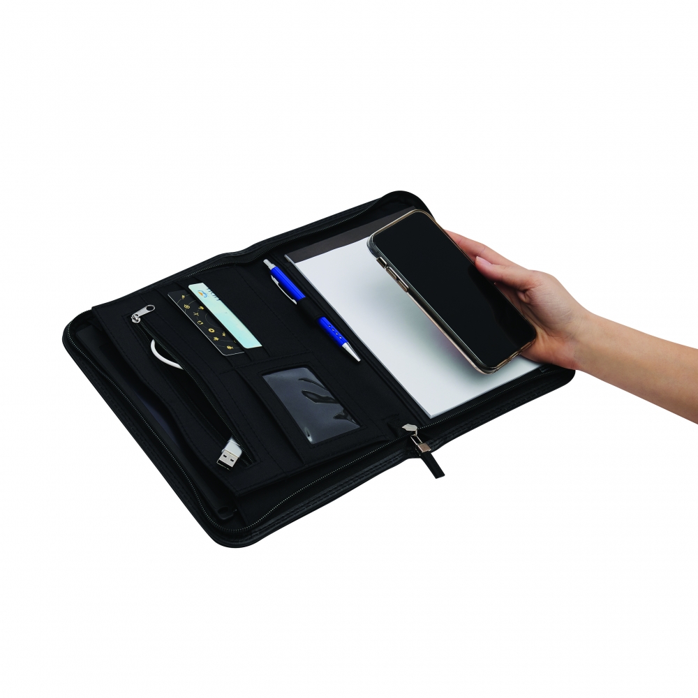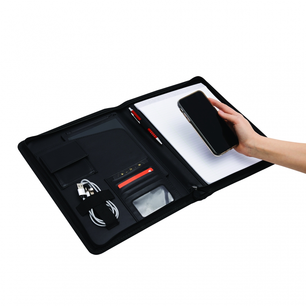 Schreibmappe A4 inklusive Powerbank (Kapazität 5.000 mAh) aus Alpha-PU, USB-Ladekabel, diversen Fächern, Tablethalterung und Schreibblock (40 Seiten). Ihre Werbung drucken wir außen auf die Schreibmappe.