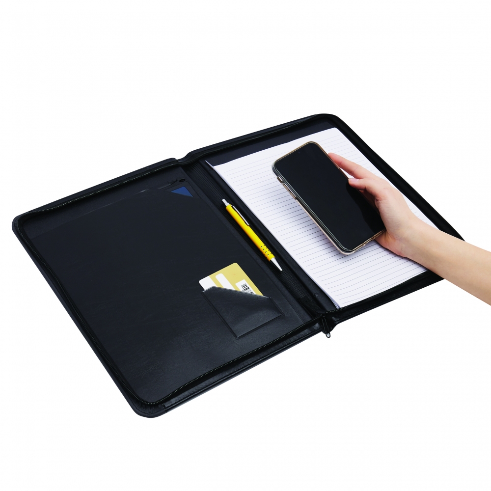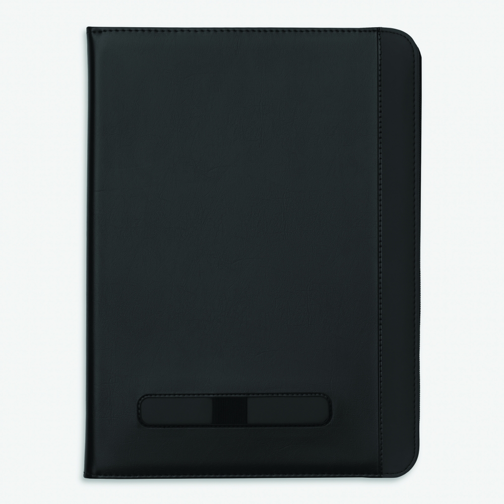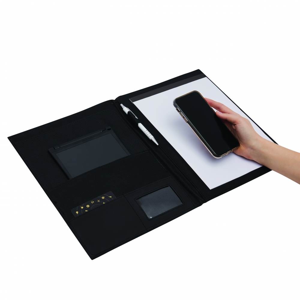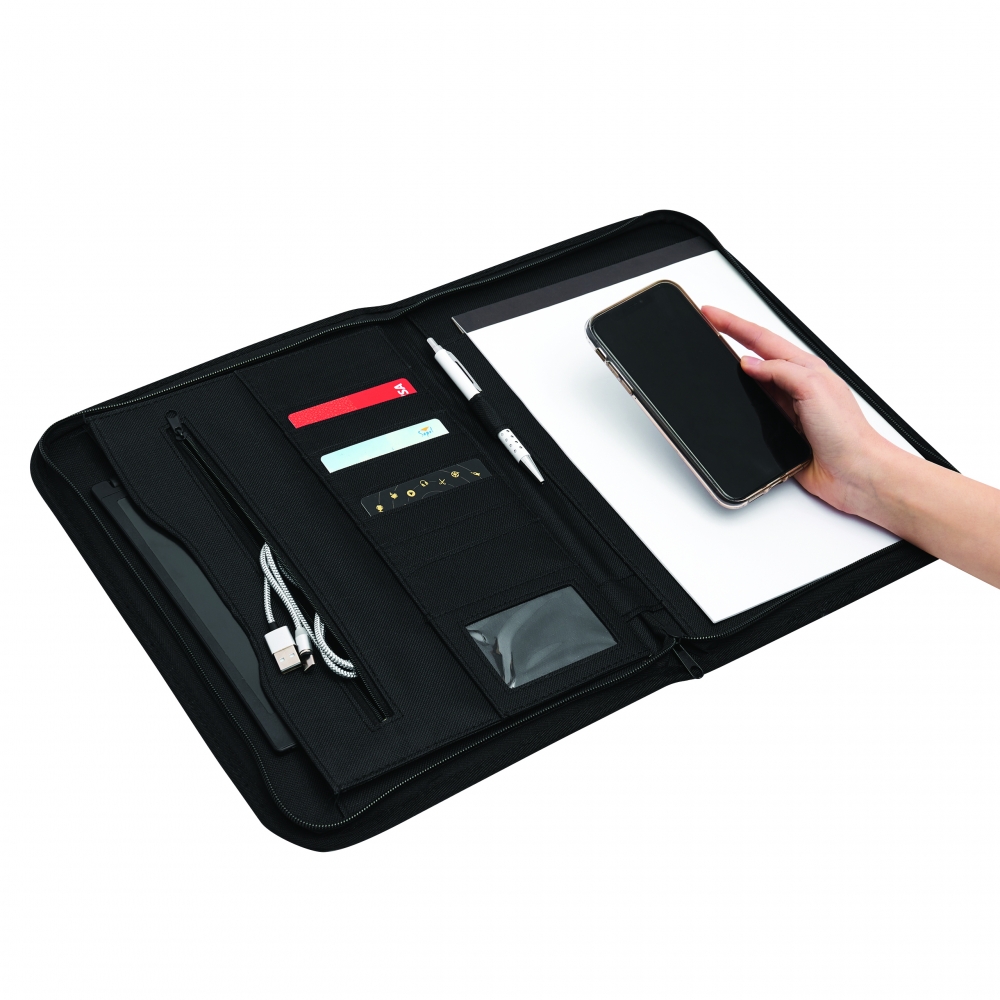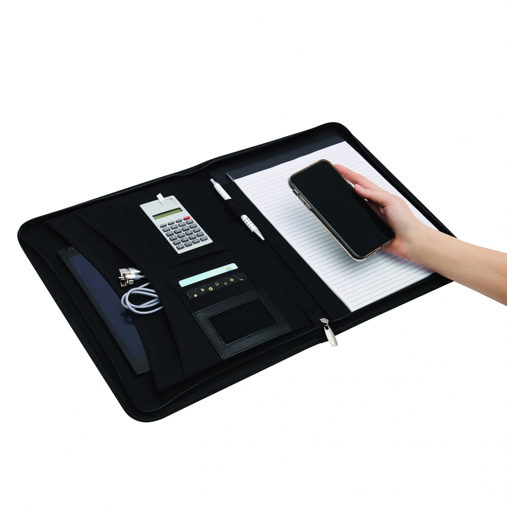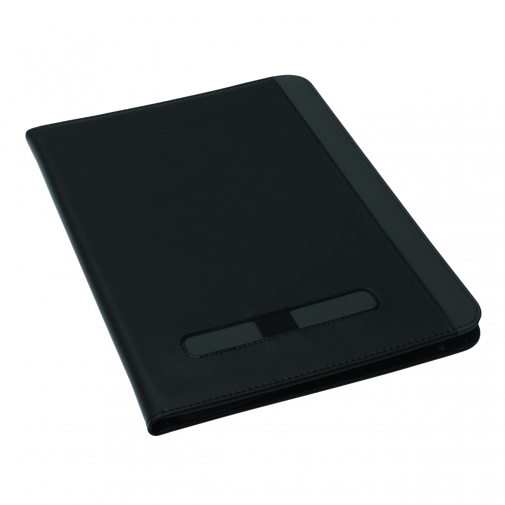 Schreibmappe A4 inklusive Powerbank (Kapazität 5.000 mAh) aus Alpha-PU, USB-Ladekabel, diversen Fächern, Tablethalterung und Schreibblock (40 Seiten). Ihre Werbung drucken wir außen auf die Schreibmappe.