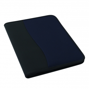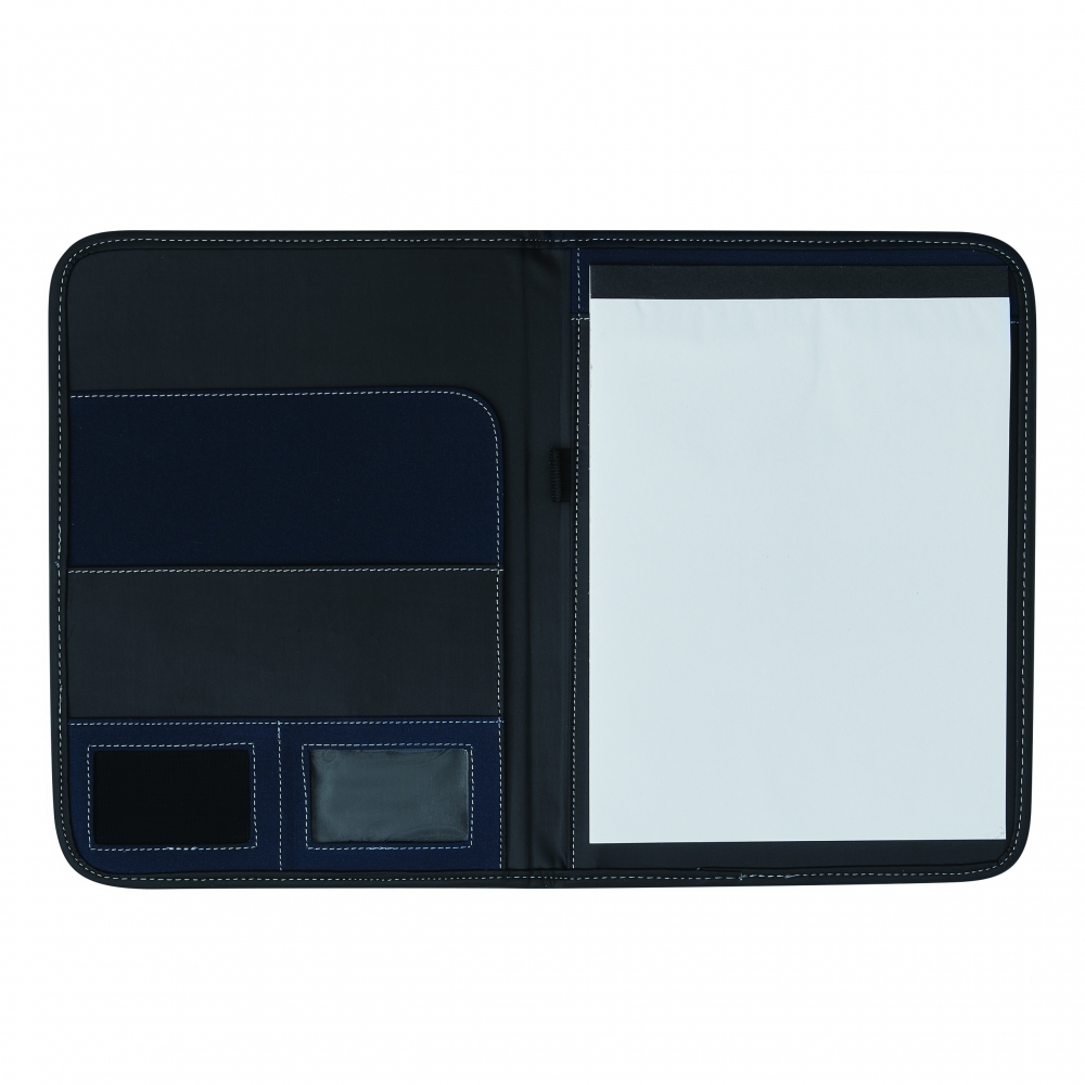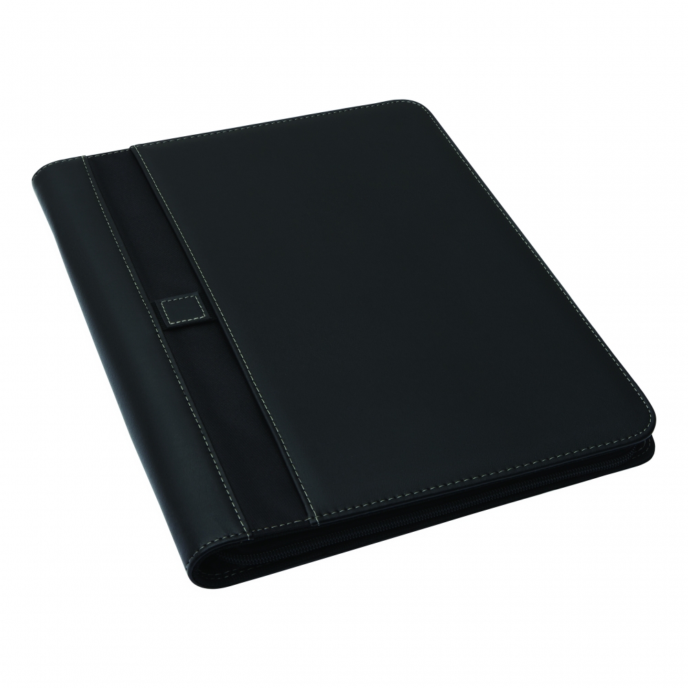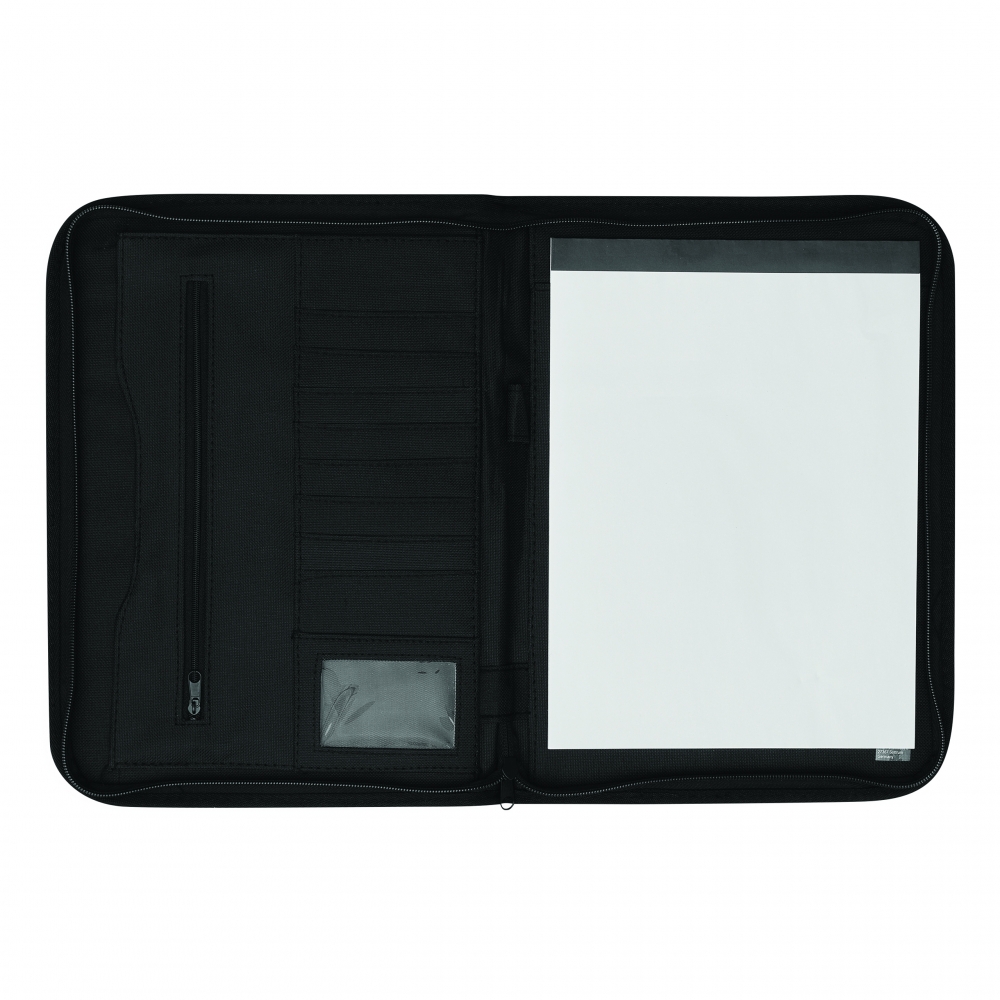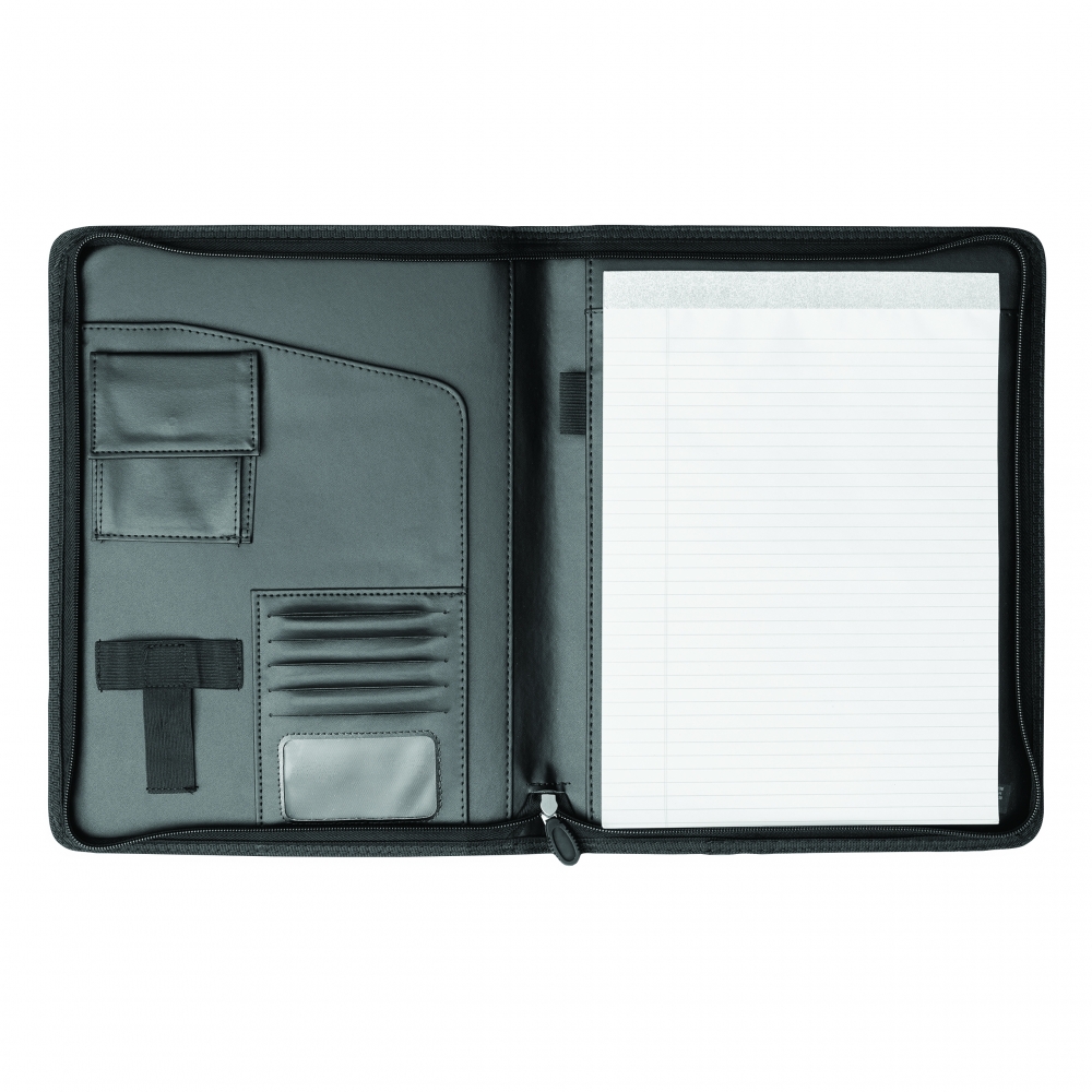 A4 Schreibmappe mit Reißverschluss aus strapazierfähigem Stoff mit diversen Fächern und einem neutralen, 40 seitigen Schreibblock. Ihre Werbung drucken wir vorne auf die Mappe, mittig auf den PU-Streifen.
