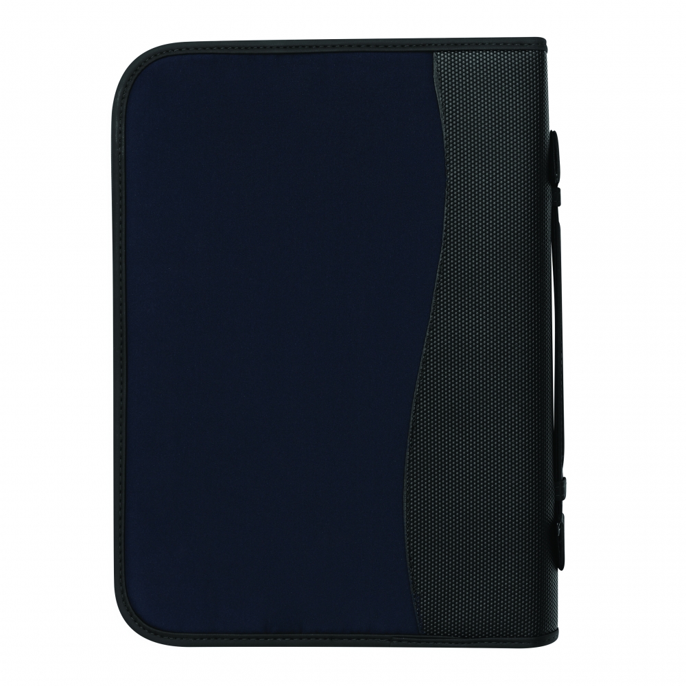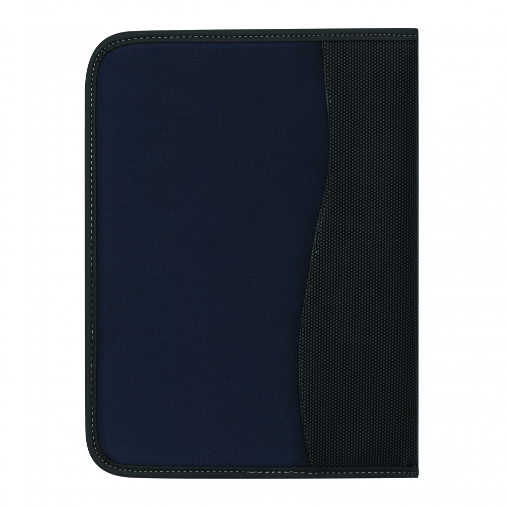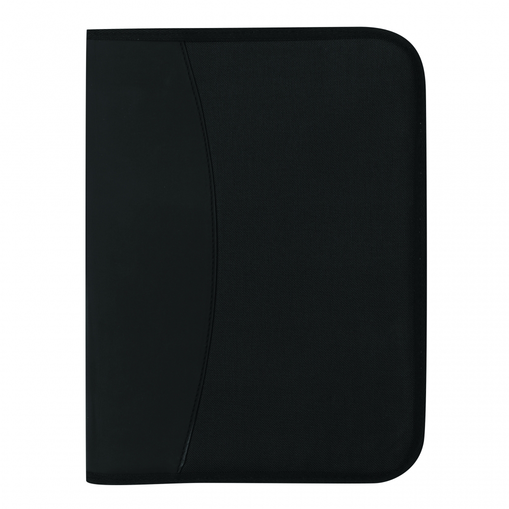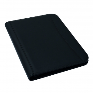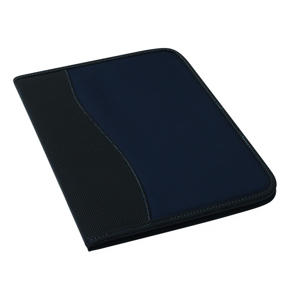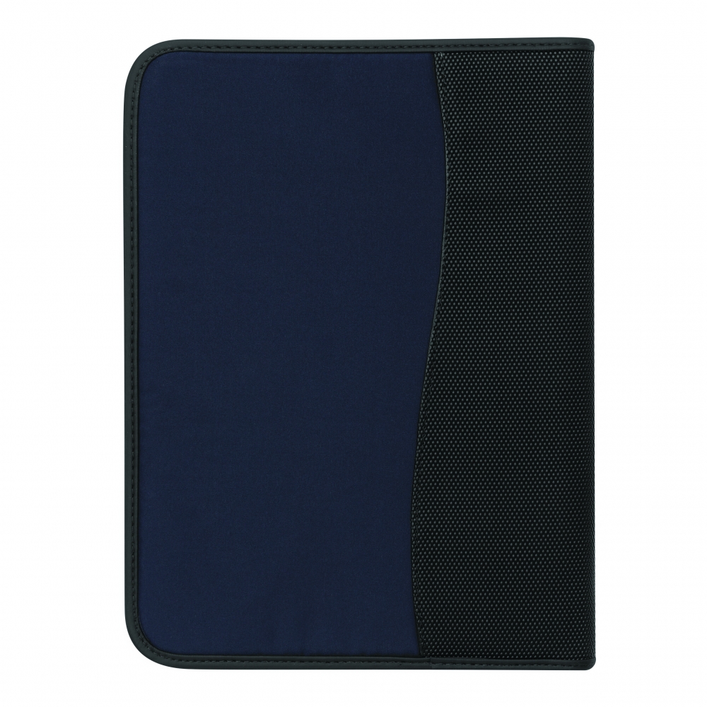 A4 Schreibmappe mit Reißverschluss aus strapazierfähigem Stoff mit diversen Fächern und einem neutralen, 40 seitigen Schreibblock. Ihre Werbung drucken wir vorne auf die Mappe, mittig auf den PU-Streifen.