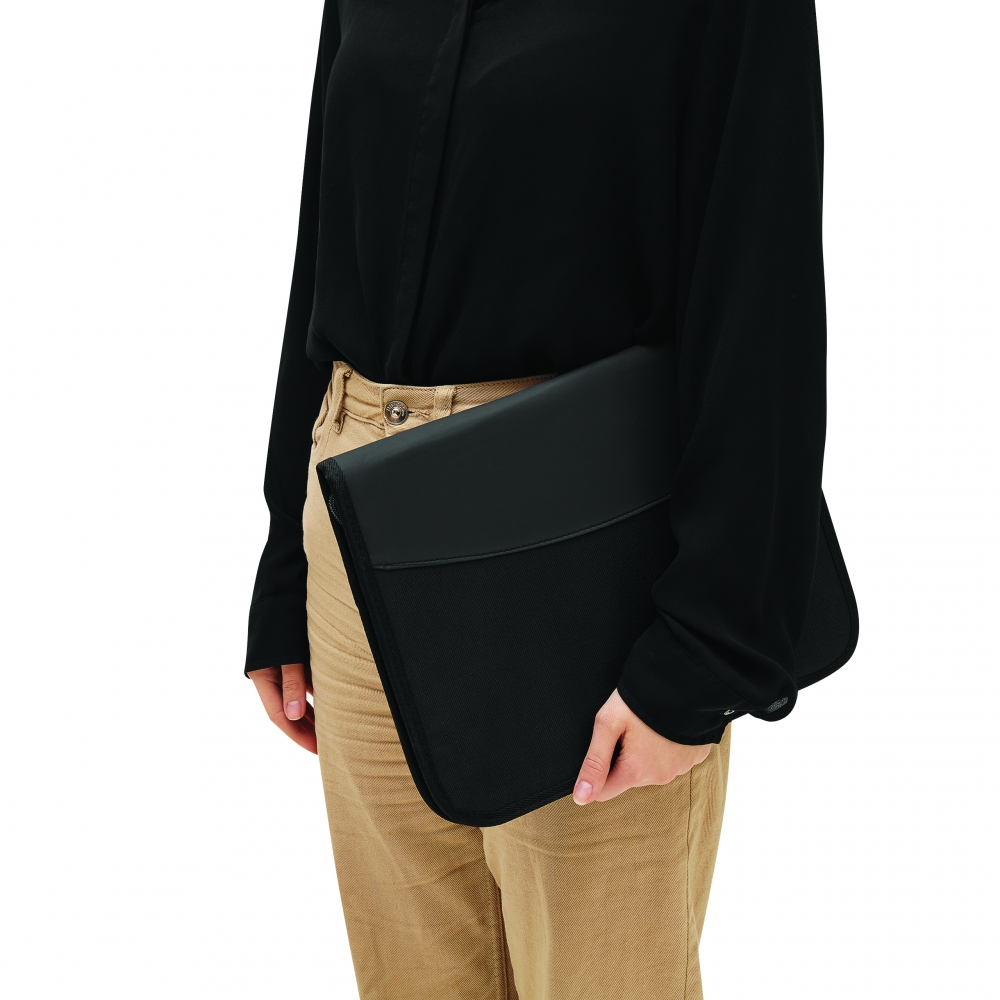 Die 2-in-1-Lösung für Ihr professionelles Meeting. Konferenzmappe mit integriertem und abnehmbarem Tablethalter. Hauptfach mit Reißverschluss. Schlaufen für Schreibgerät und USB-Stick. Inklusive A4- Schreibblock.