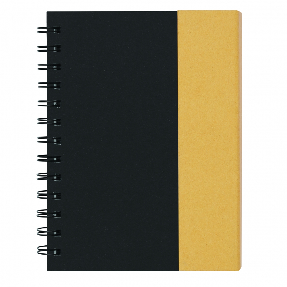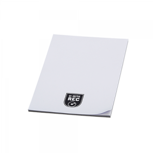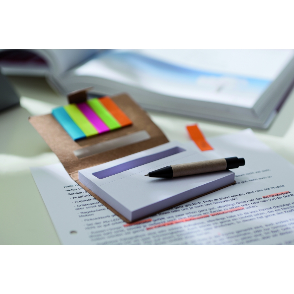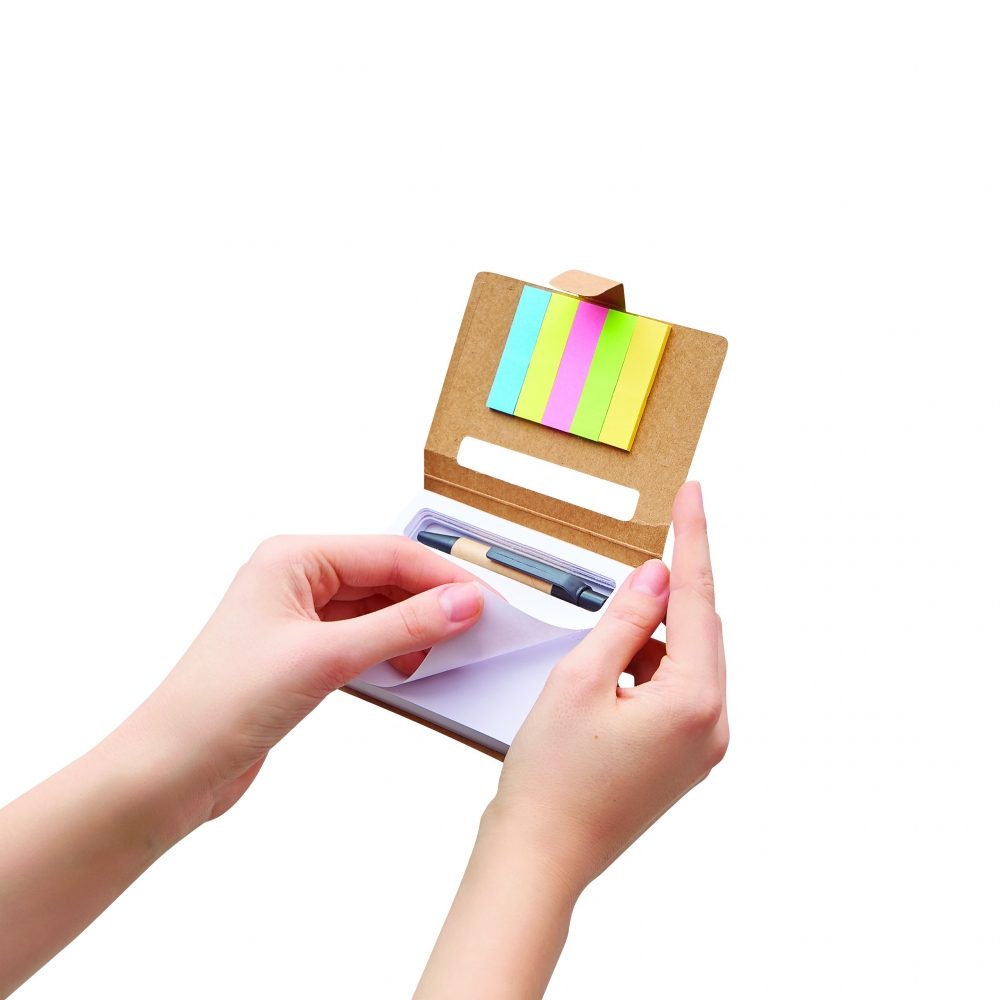 Notizblock im Ökolook, verfügt über einen Schreibblock (200 Blankoseiten), gelbe Haftnotizen (25 Blatt), fünf verschieden farbige Markierstreifen (25 Streifen je Farbe) und einen Kugelschreiber mit schwarzschreibender Mine. Ihre Werbung drucken wir außen auf den Deckel.