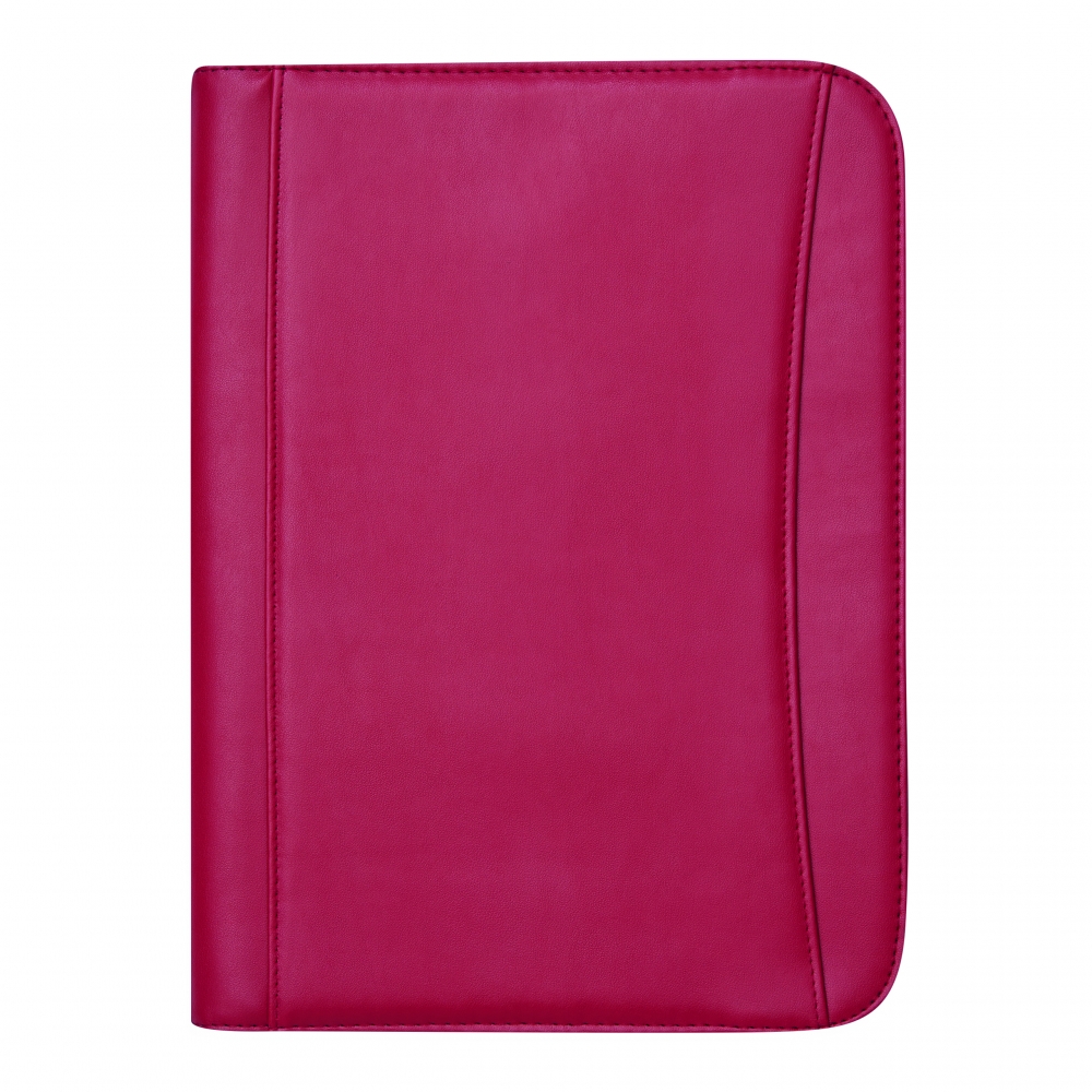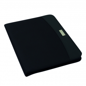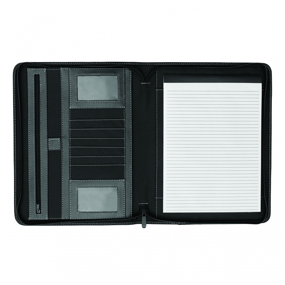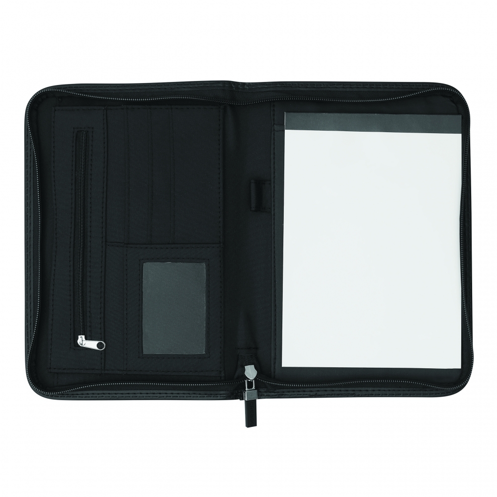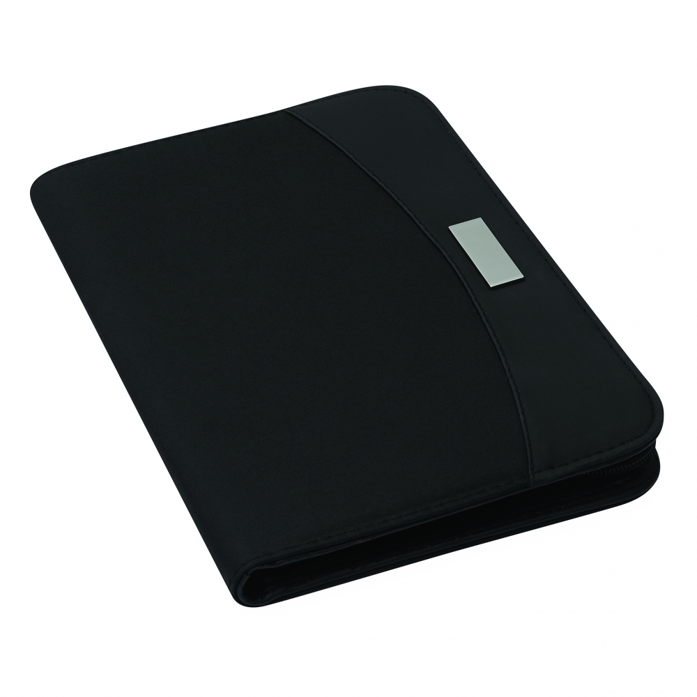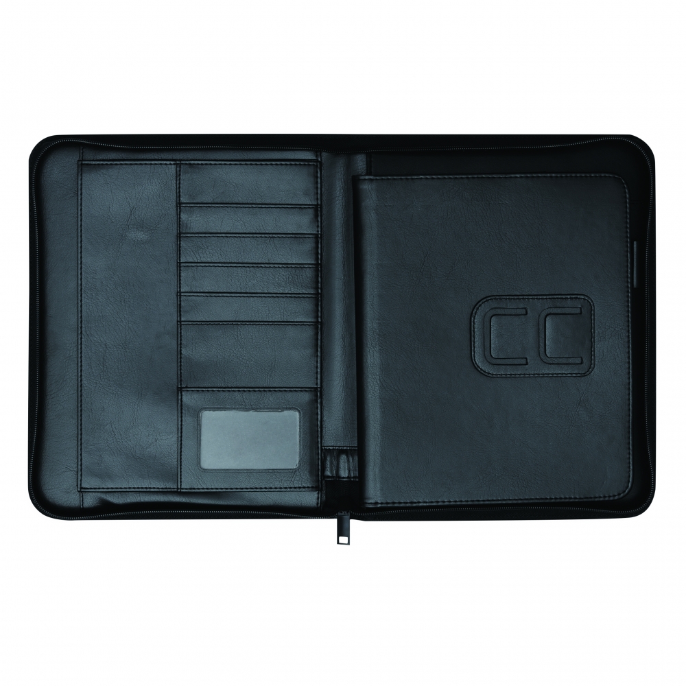 Portfolio CREADO im DIN-A5-Format: mit Schreibblock, Reißverschlussfach, diversen Einsteckfächern und umlaufendem Reißverschluss, Aluminiumplättchen für Ihre Werbeanbringung