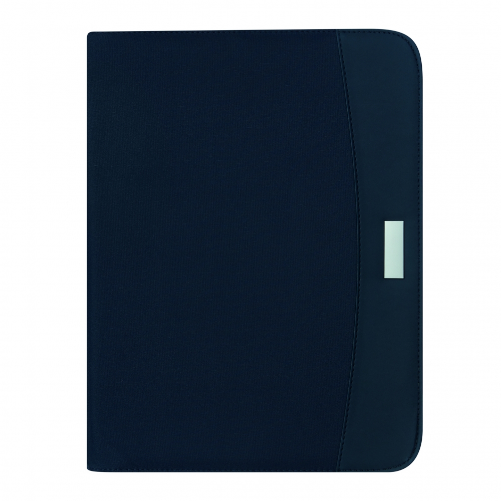 Schreibmappe A4 aus Leinenimitation und PU mit Magnetverschluss, einem Smartphone- und Kartenfach. Die Mappe hat ein veredelbares Metallplättchen mit gummierter Oberfläche und ein Notizblock mit 40 linierten Seiten (60 g / m²). Kugelschreiber und Zubehör nicht enthalten. 233 x 310 x 18 mm | Plättchen: 50 x 30 mm