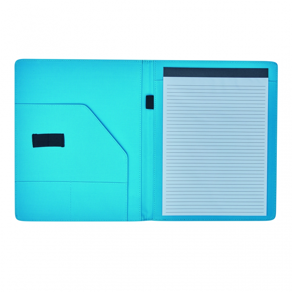A4 Schreibmappe aus strapazierfähigem Stoff mit Kugelschreiberschlaufe, sieben Einsteckfächern, vier Gummibändern, einem Handyfach, einer Tablet- / Smartphonehalterung und einem linierten Schreibblock (60 Seiten). Die Werbung drucken wir vorne auf die Mappe.