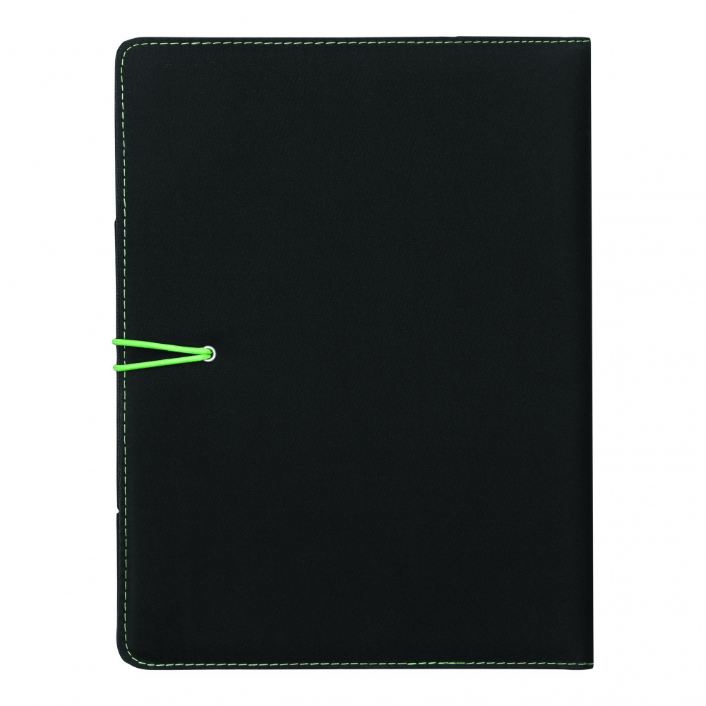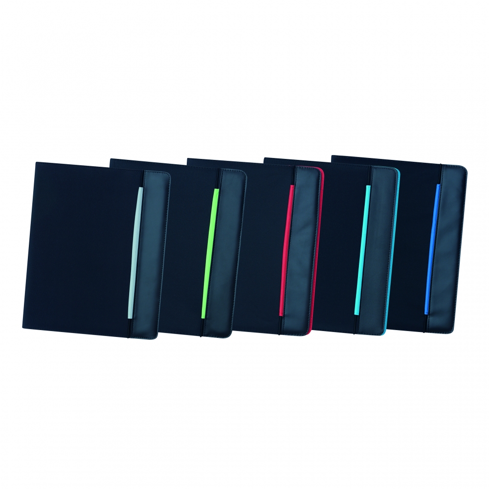 Schwarze Schreibmappe mit Organizer-Elementen; verschließbar mit farbigem Gummiband; inkl. Schreibblock; flaches Einsteckfach; Gummischlaufe für Kugelschreiber