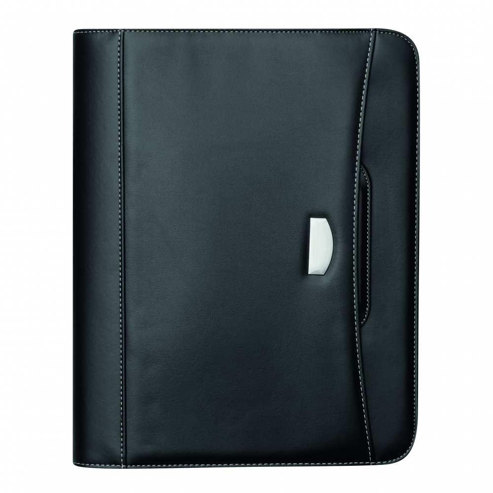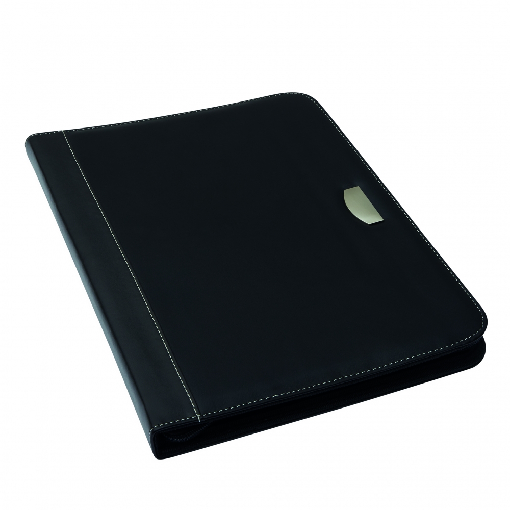 Portfolio NOBLESSE ZIP im DIN-A4-Format: umlaufender Reißverschluss zum Verschließen, innen diverse Einsteckfächer, 1 Netzfach, inkl. Schreibblock (liniert), Schlaufe für 1 Schreibgerät, Taschenrechner, außen dekorative Ziernähte, in Leder-Optik mit Metallplättchen für Ihre Werbeanbringung