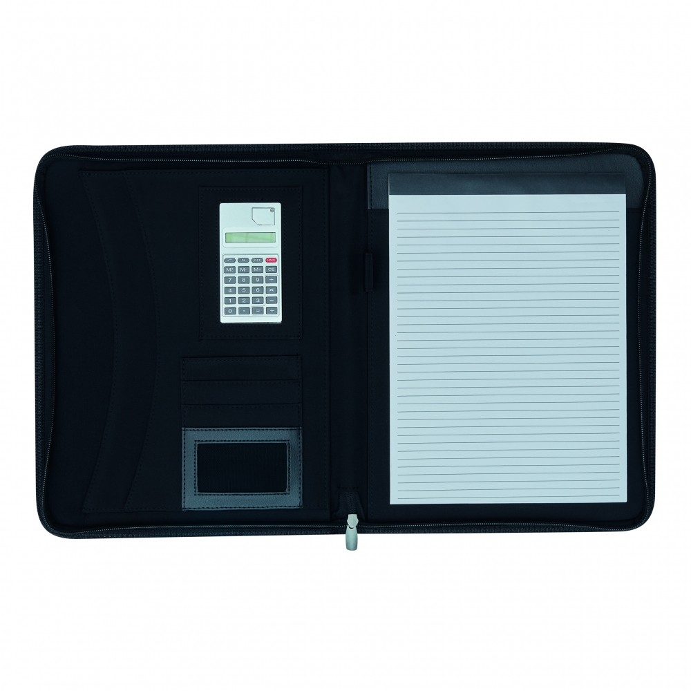 Dokumentenmappe aus Mikrofaser, ca. DIN A4-Format, mit Reißverschluss, integriertem Dual-Power-Taschenrechner mit 8 Ziffern, 7 Einsteckfächern, 3 Stifthaltern (ohne Stifte) und Schreibblock (liniert).