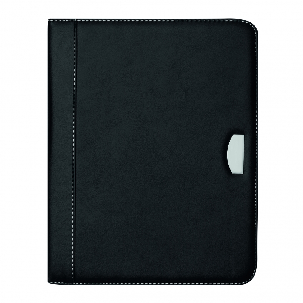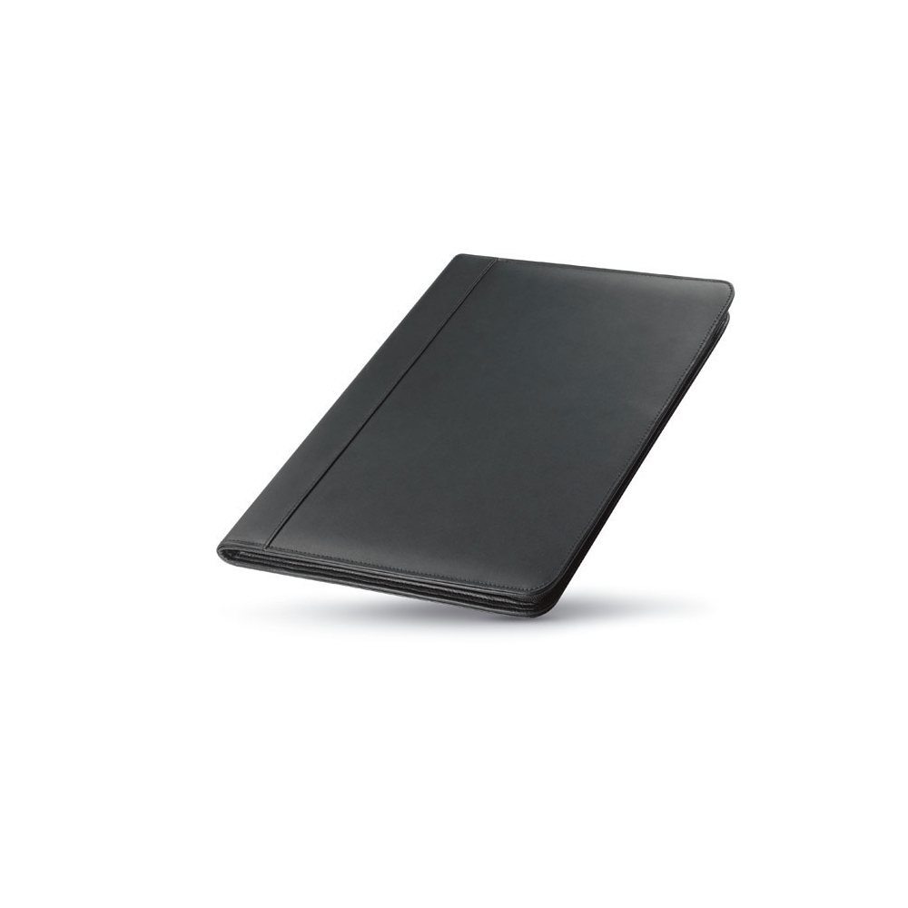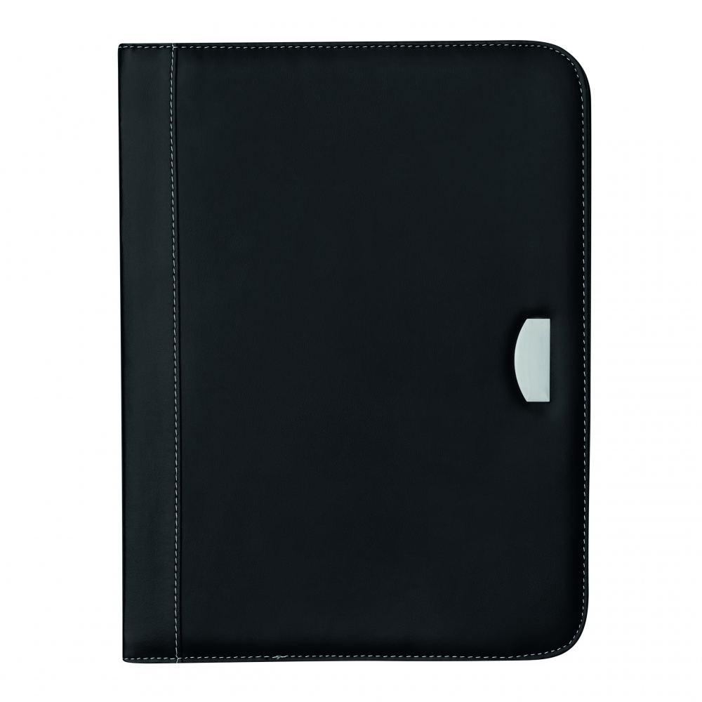 Konferenzmappe aus PU, ca. DIN A4-Format, mit 4 Einsteckfächern, Stifthalter (ohne Stift), Metallplätchen für Gravuren und Schreibblock mit 25 linierten Blättern.
