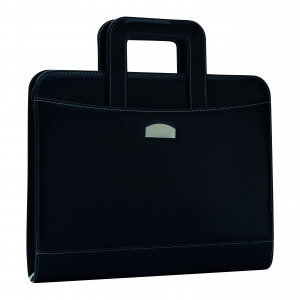 Dokumentenmappe aus Kunstleder, ca. DIN A4-Format, mit Reißverschluss, Ringbucheinsatz und Tragegriff, 7 Einsteckfächern, Handyfach, Schreibblock (liniert) und Metallplätchen für Gravuren.