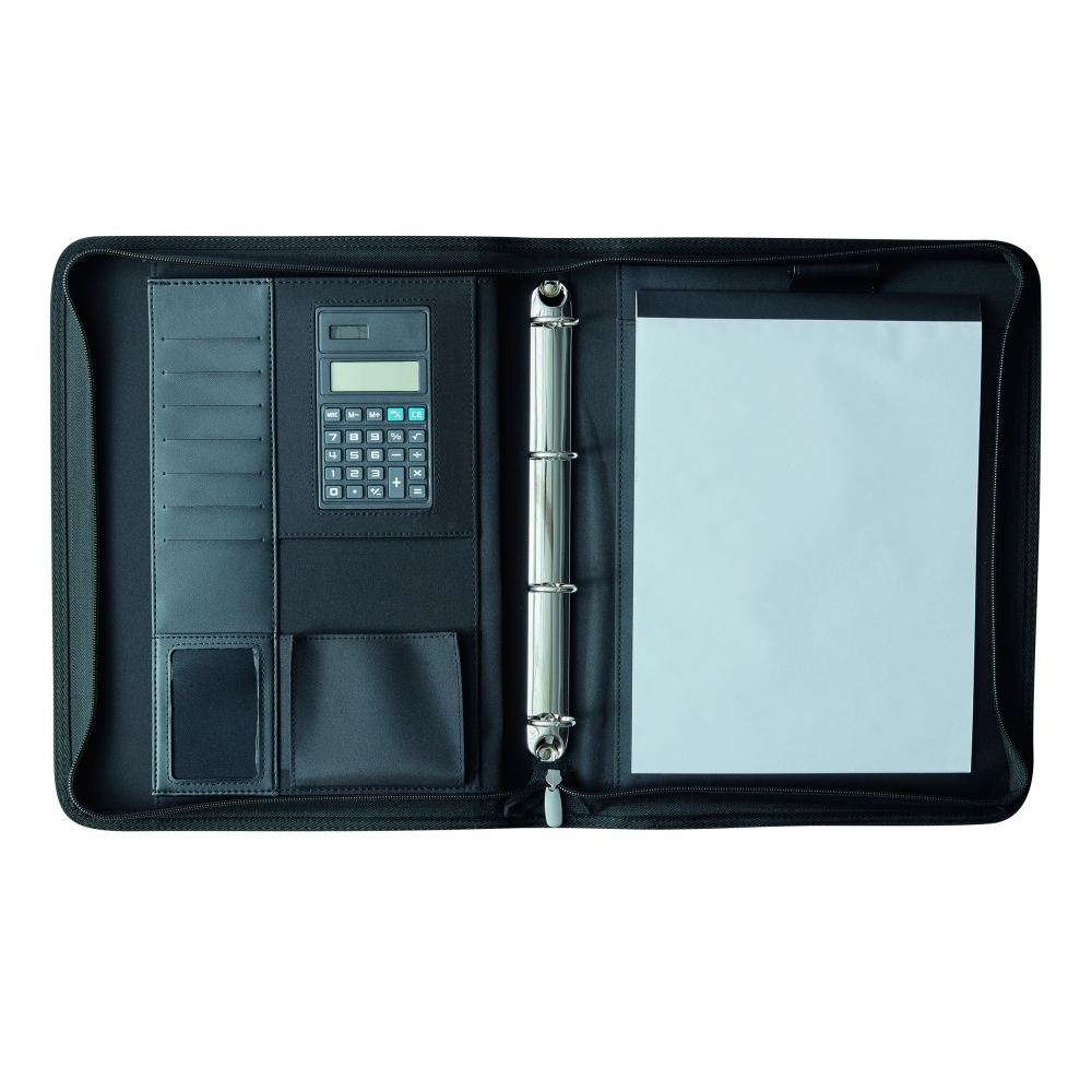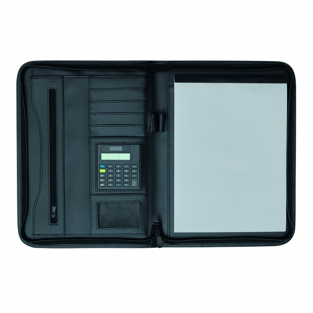 Schreibmappe / Dokumentenmappe aus 600D Polyester / Lederimitat im DIN A5-Format. Mit mehreren Einsteckfächern, herausnehmbarem Dualpower-Solarrechner (inkl. Zellbatterie) und Rundum-Reißverschluss. Inkl. Schreibblock und Kugelschreiber.