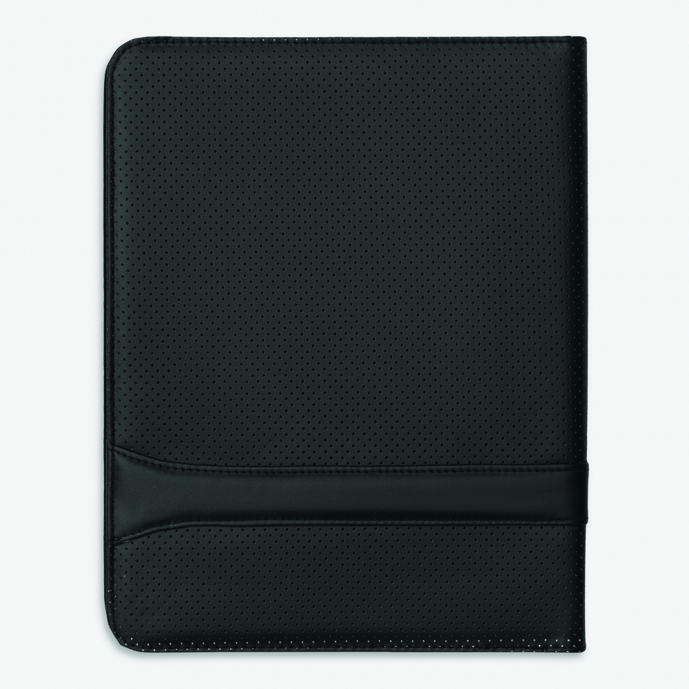 Portfolio MANHATTAN im DIN-A4-Format: umlaufender Reißverschluss, innen diverse Einsteckfächer, 1 Klarsichtfach, Reißverschluss-Innenfach, inkl. Schreibblock (liniert), Schlaufe für 1 Schreibgerät – außen mit gestanzter Loch-Optik mit Metallplättchen für Ihre Werbeanbringung