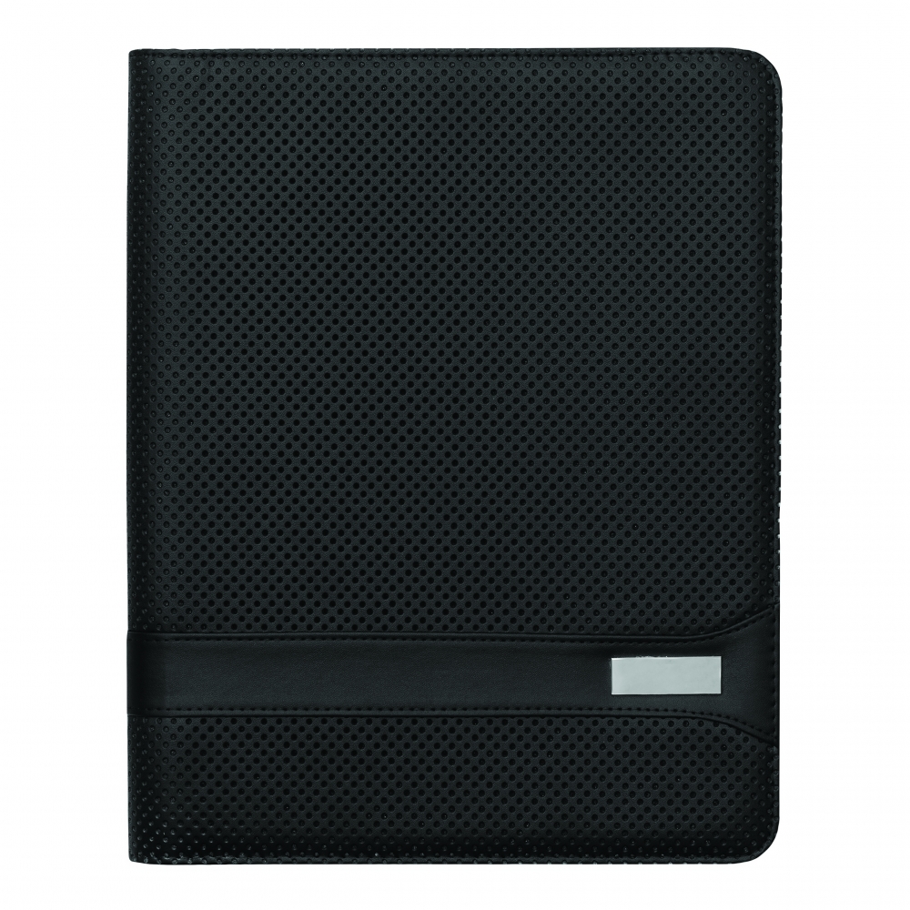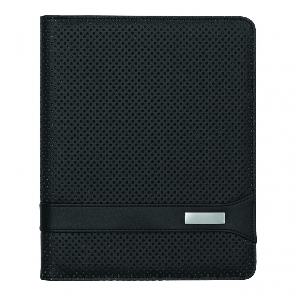 Portfolio HILL DALE im DIN-A5-Format: innen diverse Einsteckfächer, inkl. Schreibblock (liniert), Schlaufe für 1 Schreibgerät – außen in gestanzter Loch-Optik mit Metallplättchen für Ihre Werbeanbringung