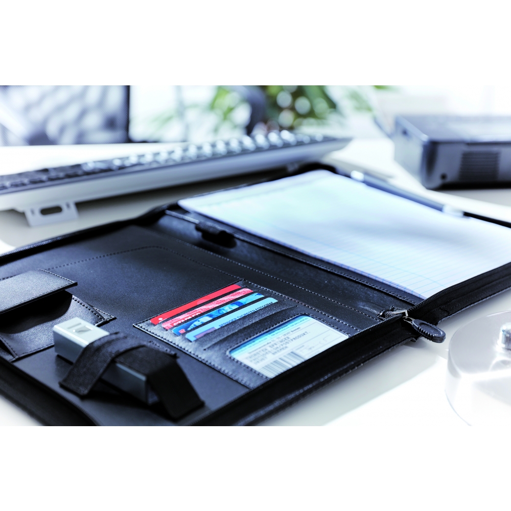 Schreibmappe mit Organizer-Elementen; verschließbar mit Reißverschluss; flaches Einsteckfach auf der Front; flaches Einsteckfach innen; diverse Karten-Einsteckfächer; Gummischlaufen für z. B. USB-Stick, Kugelschreiber etc.; Klett-Lasche zum Aufstellen von digitalen Geräten; inkl. Schreibblock