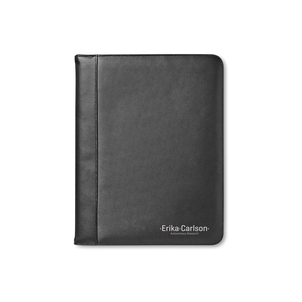 Dokumentenmappe aus Kunstleder, ca. DIN A4-Format, mit Reißverschluss, Stifthalter (ohne Stift), 8 Einsteckfächern, Schreibblock (liniert) und Metallplätchen für Gravuren.