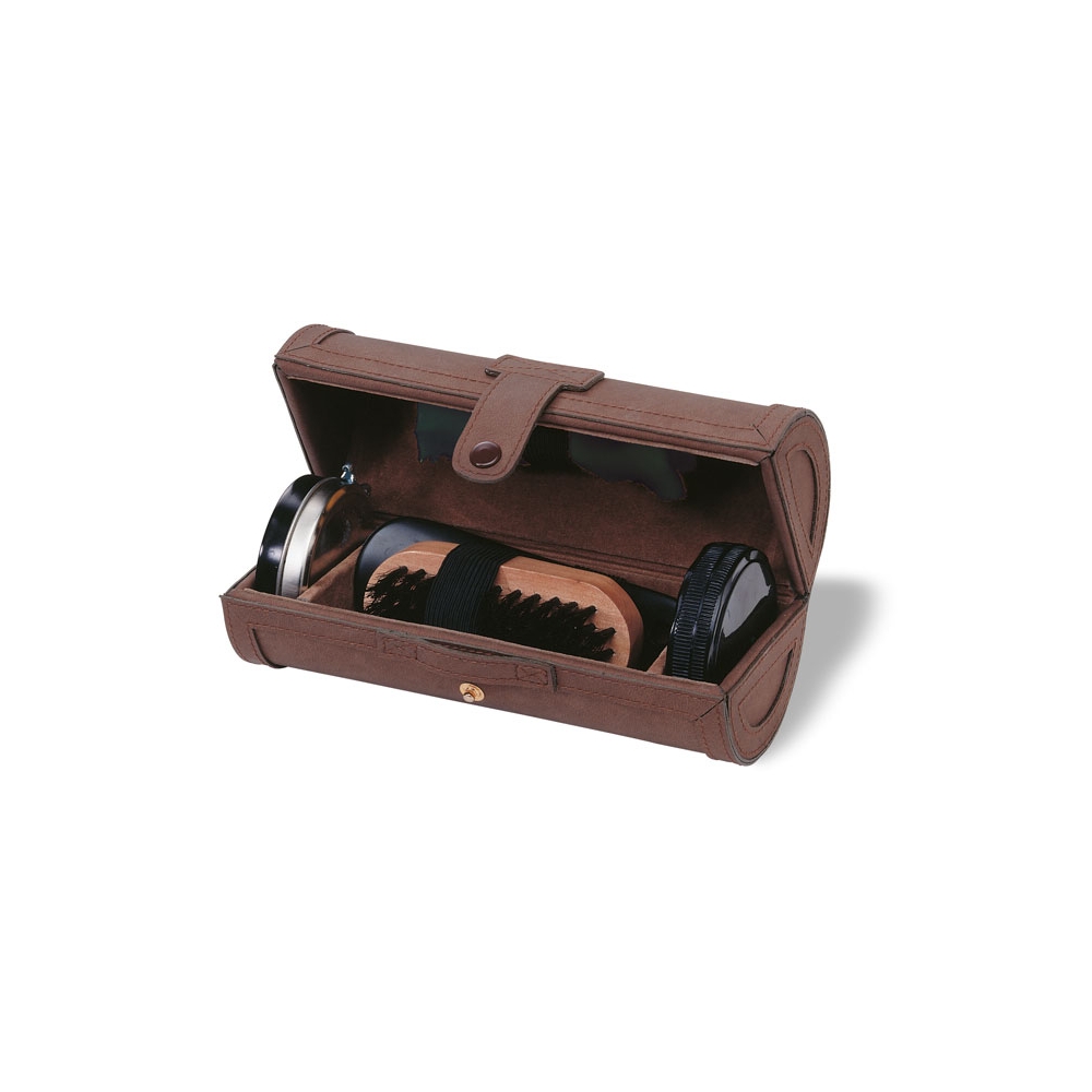 5-teiliges Schuhputz-Set im luxuriösen Etui aus Kunstleder. Dieses Set beinhaltet ein schwarzes Schuhputztuch, einen schwarzen Schuhlöffel, eine Schmutzbürste, einen Schuhschwamm sowie farblose Schuhcreme.