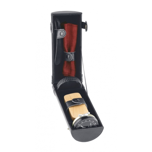 SHINBO Schuhputzset aus lederähnlichem Material (PU). Enthält klare Politur, Reiniger, Schuhlöffel, Tuch und Bürste.