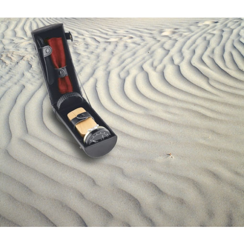 5-teiliges Schuhputzset in einer Metalldose. Das Set beinhaltet ein gelbes Poliertuch, einen Schuhlöffel, eine Schmutzbürste, eine kleine Bürste für die feinen Details und eine farblose Schuhcreme.