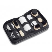 6-teiliges Schuhputz-Set in einem hochwertigen Rollenetui aus Kunstleder mit Druckknopf. Creme und Politur in neutralem transparenten Ton. Ihre Werbung drucken wir oben mittig auf den Deckel des Etuis.
