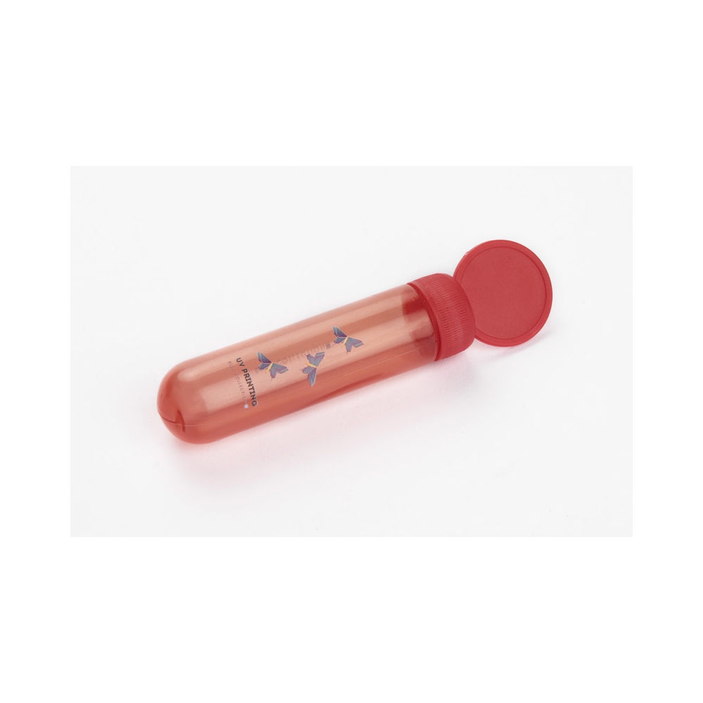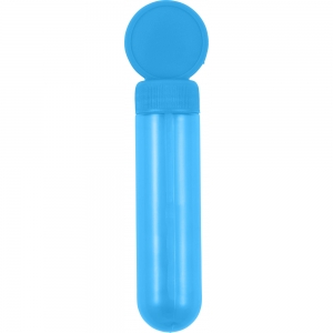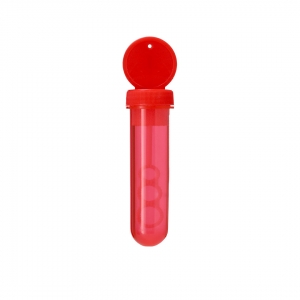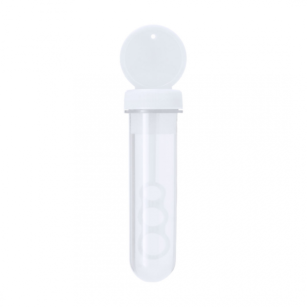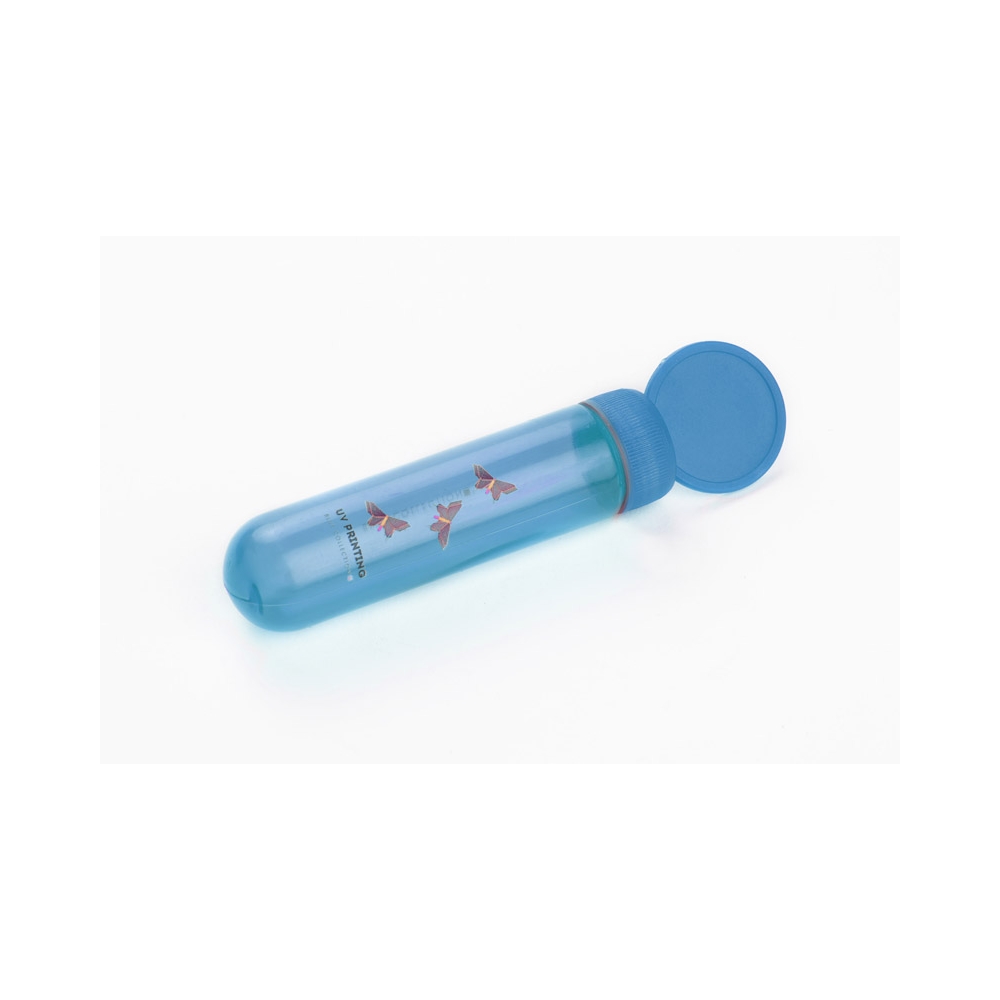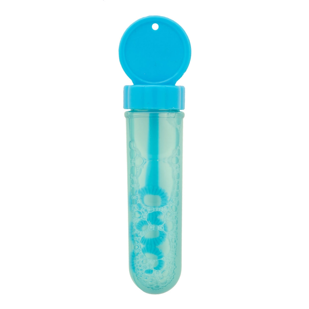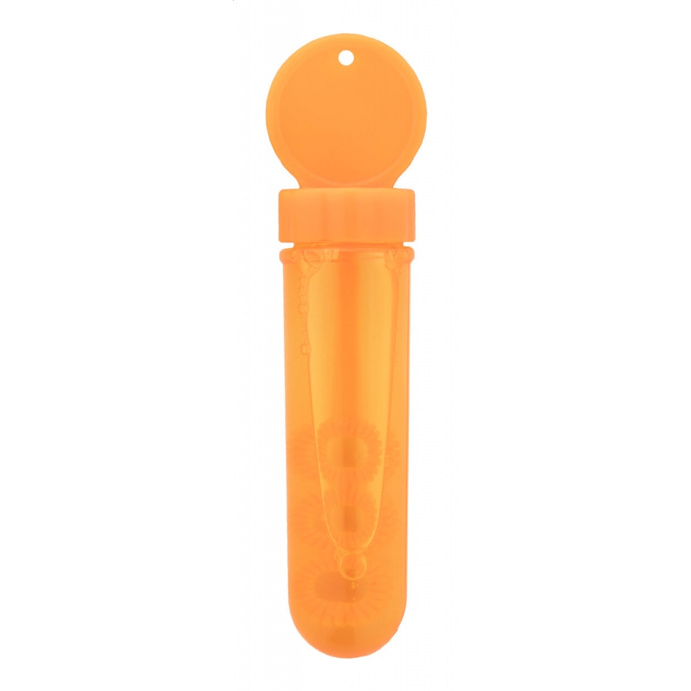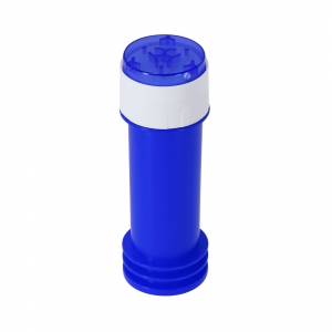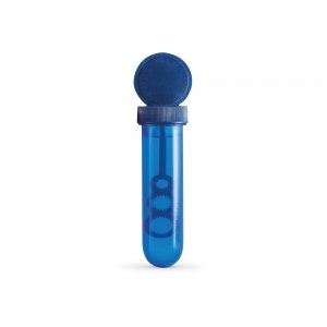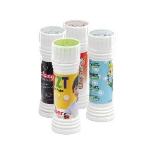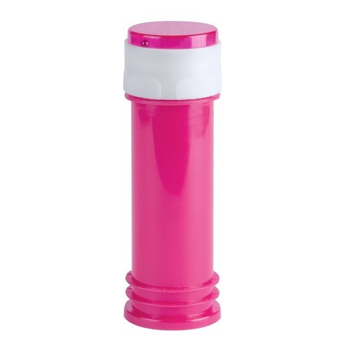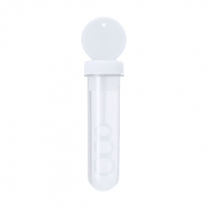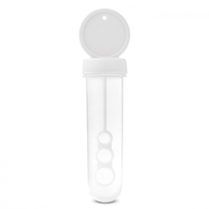 Seifenblasenmaschine mit speziellem Applikator, die Blasen in 3 Größen erzeugt. Flüssigkeit enthalten (30 ml). Mit festfarbigem Deckel und transluzentem Körper.