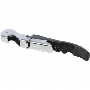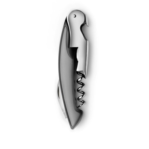 Griff aus schwarzem ABS. Klinge zur Entfernung der Weinmanschette, Korkenzieher mit 5 Spiralen, Hebel zur anstrengungsfreien Entfernung des Korkens, Flaschenöffner.