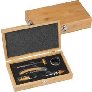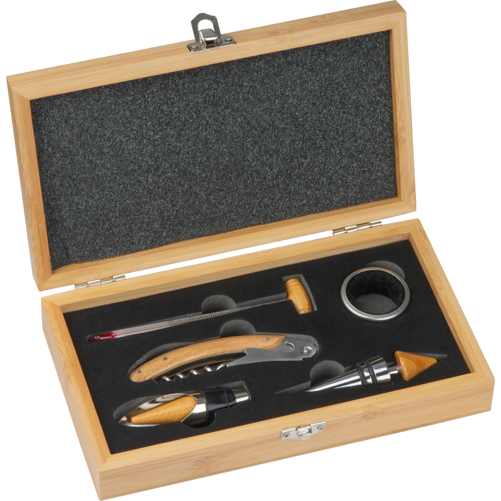 4-teiliges Weinset bestehend aus einem Kellnermesser, einem Stopfen, einem Ausgießer und einem Ring. Geliefert in einer Bambus-Geschenkbox, die nach nachhaltigen Standards bezogen und produziert wird.
