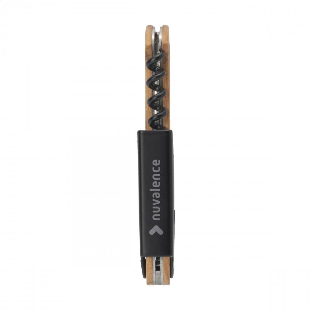 Ausklappbares Kellnermesser aus Metall mit Bambusgriff und 4 Funktionen: Korkenzieher, 2 Flaschenöffner und Folienabschneider.