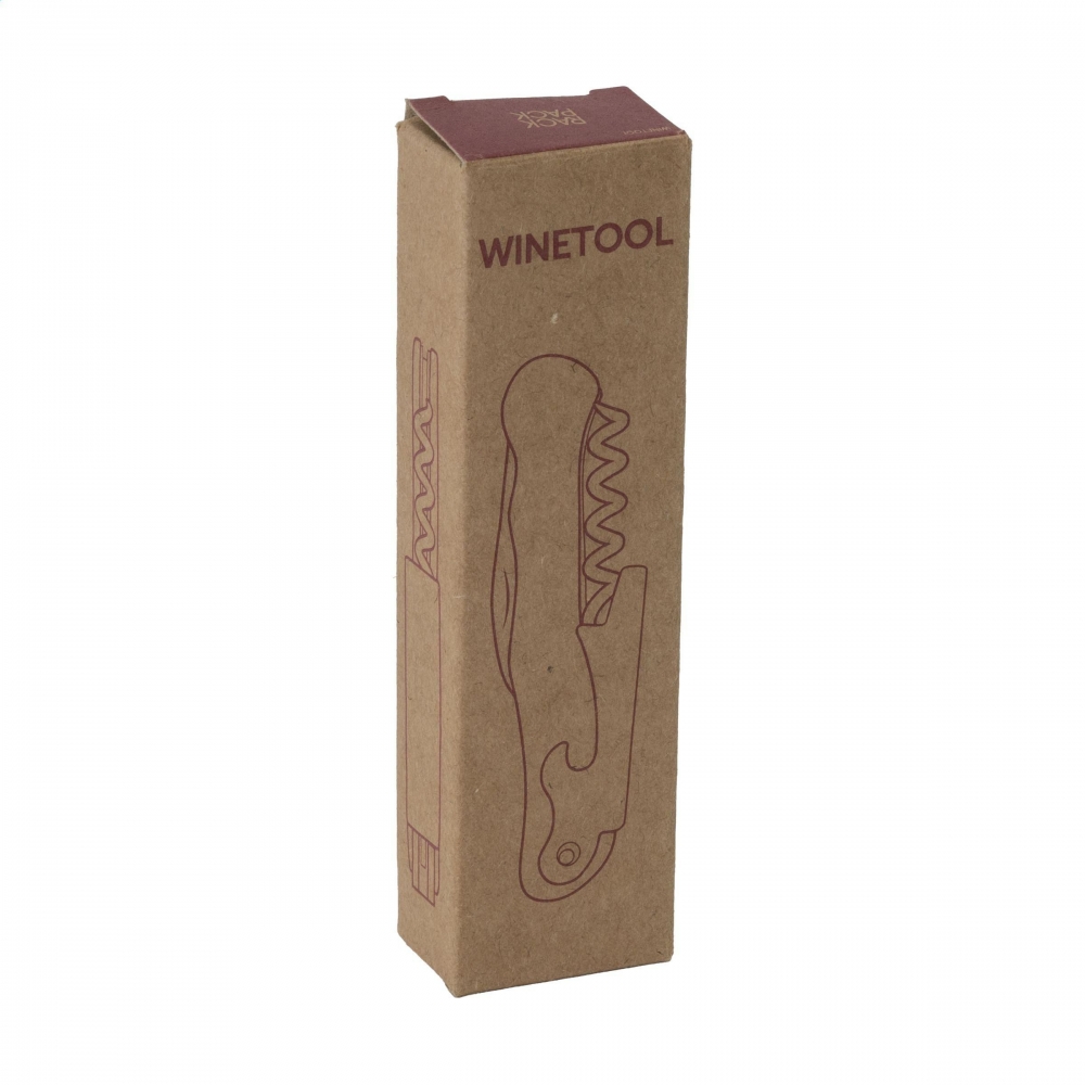 Weinset aus PU mit Korkoptik mit 4 Zubehörteilen. Inklusive Kellnermesser, Flaschenverschluss, Tropffänger und Einfüllstutzen. Einzeln verpackt in einer braunen Kartonbox.