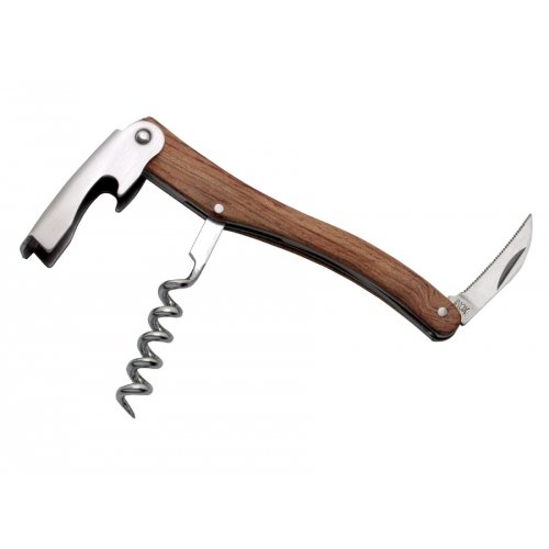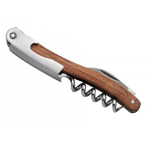 Professionelles Kellnermesser. Griff aus braunem Massivholz und Edelstahl. Fein gezahnte Klinge zur Entfernung der Weinmanschette, Korkenzieher mit 5 Spiralen, Flaschenöffner.