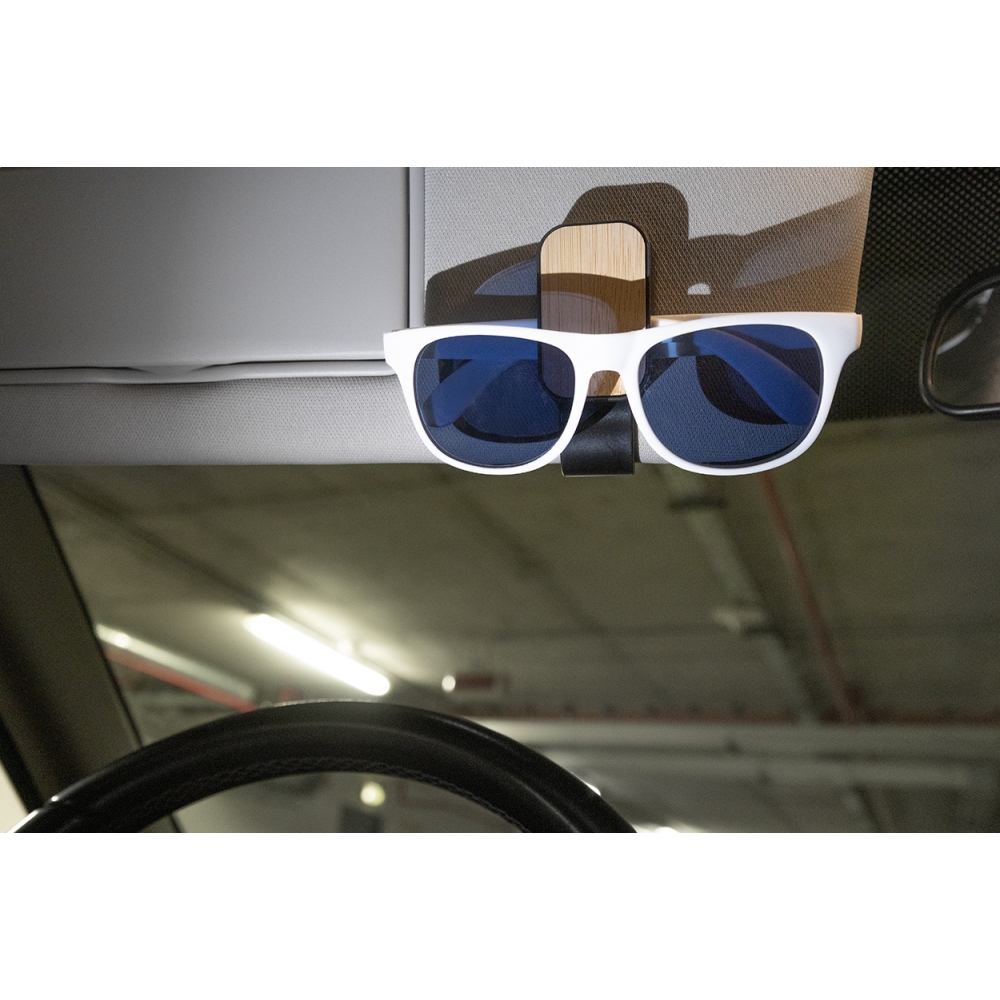 Praktischer Brillenhalter für die Sonnenblende im Auto, aus recyceltem ABS und Bambus.
