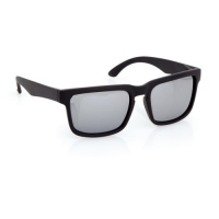 Stylische Sonnenbrille aus Kunststoff, zweifarbig mit verspiegelten Gläsern, die natürlich UV 400 Schutz der Filterkategorie 3 haben. Die Werbung wird außen auf den schwarzen Bügel gedruckt.