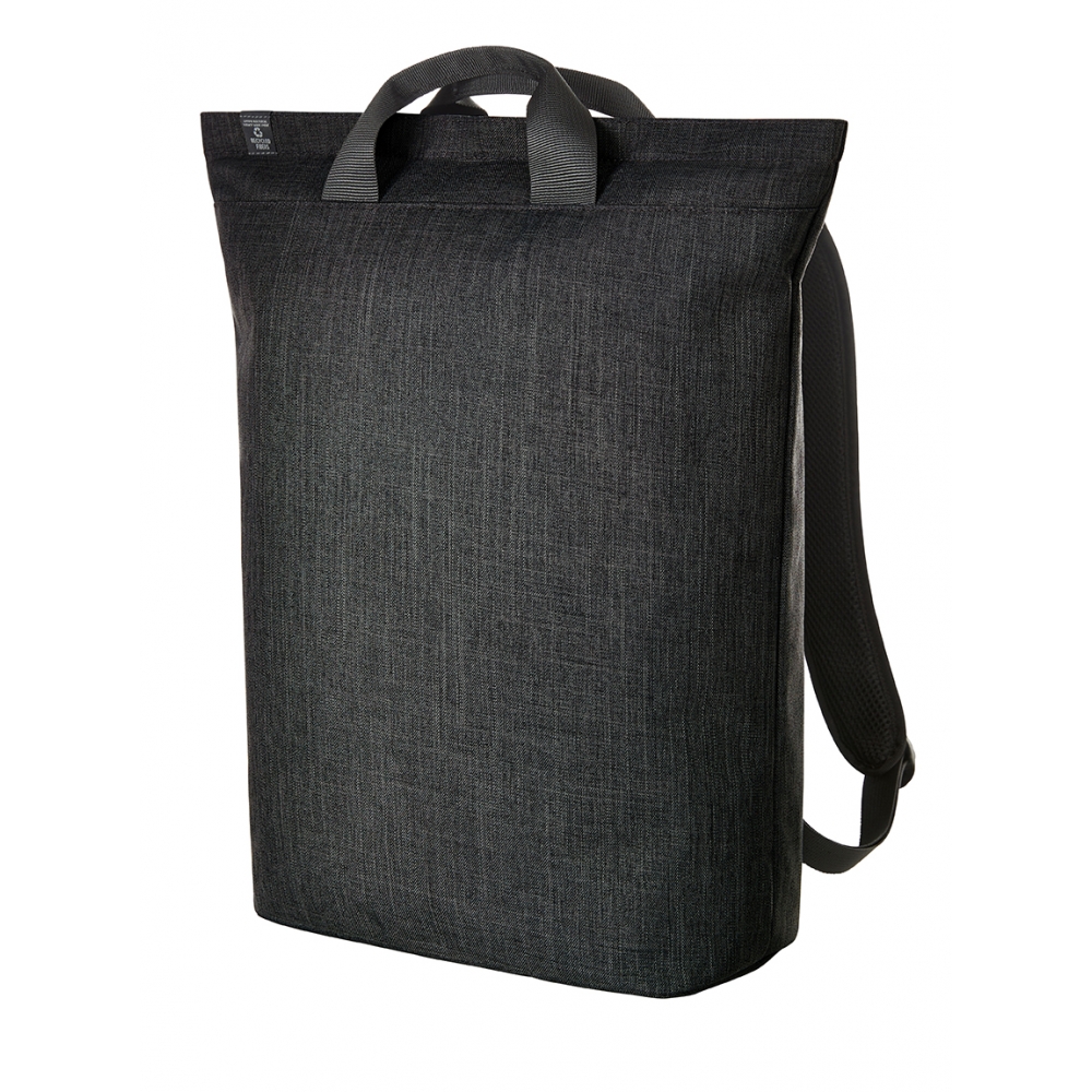 Gradliniger, moderner Rucksack; Reißverschluss-Hauptfach mit gepolstertem Notebookfach; rPET Obermaterial; wertige Metall-Accessoires; gepolsterter Boden; aufwändig gepolsterter Rücken mit verstecktem Reißverschlussfach; längenverstellbare gepolsterte Schultergurte mit Gummischlaufen zum Befestigen von z. B. Sonnenbrille; Handgriffe