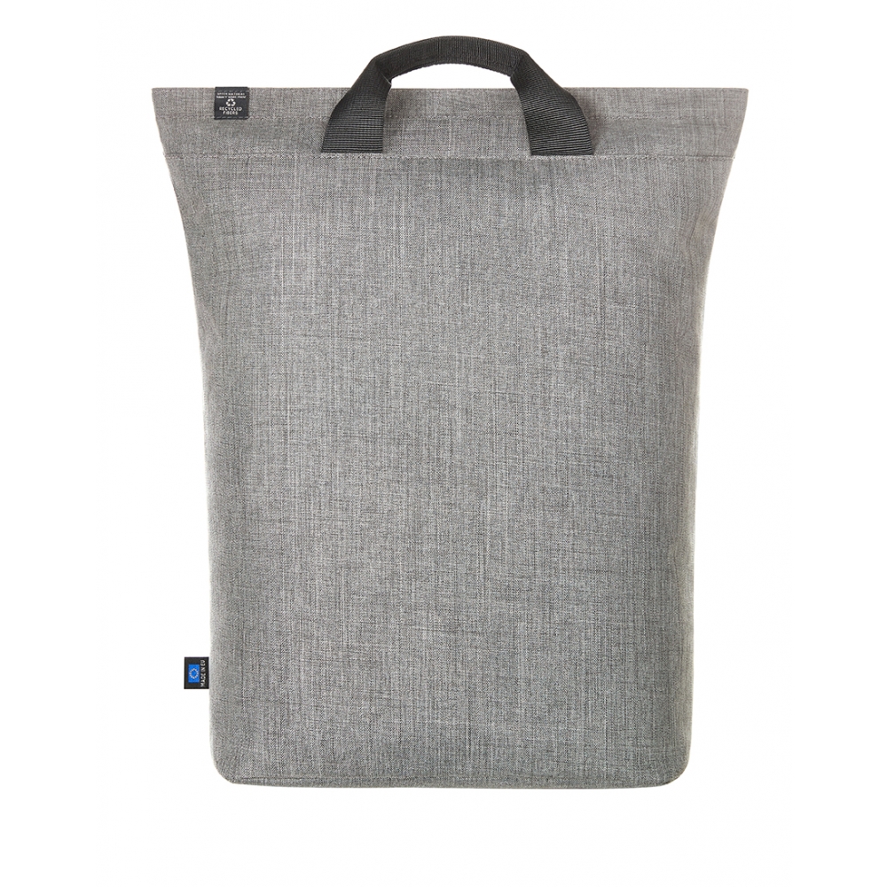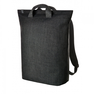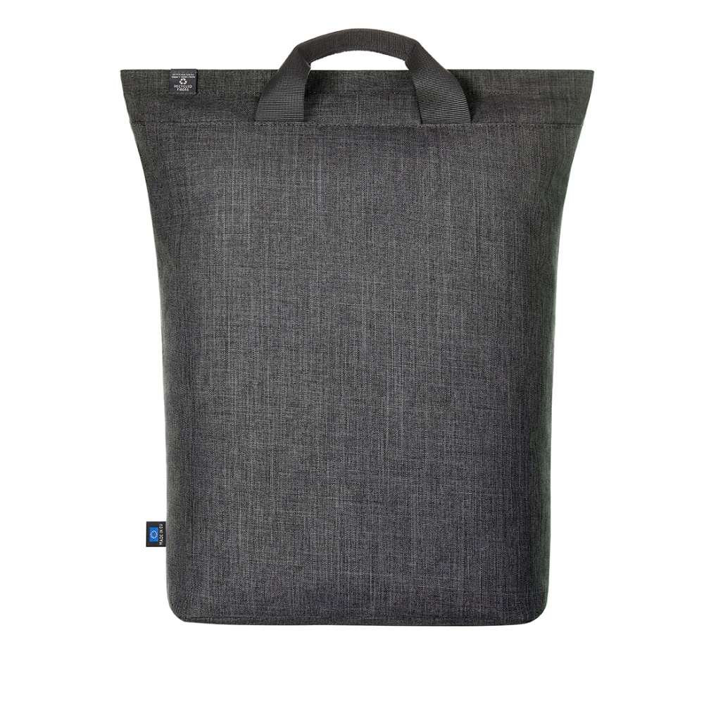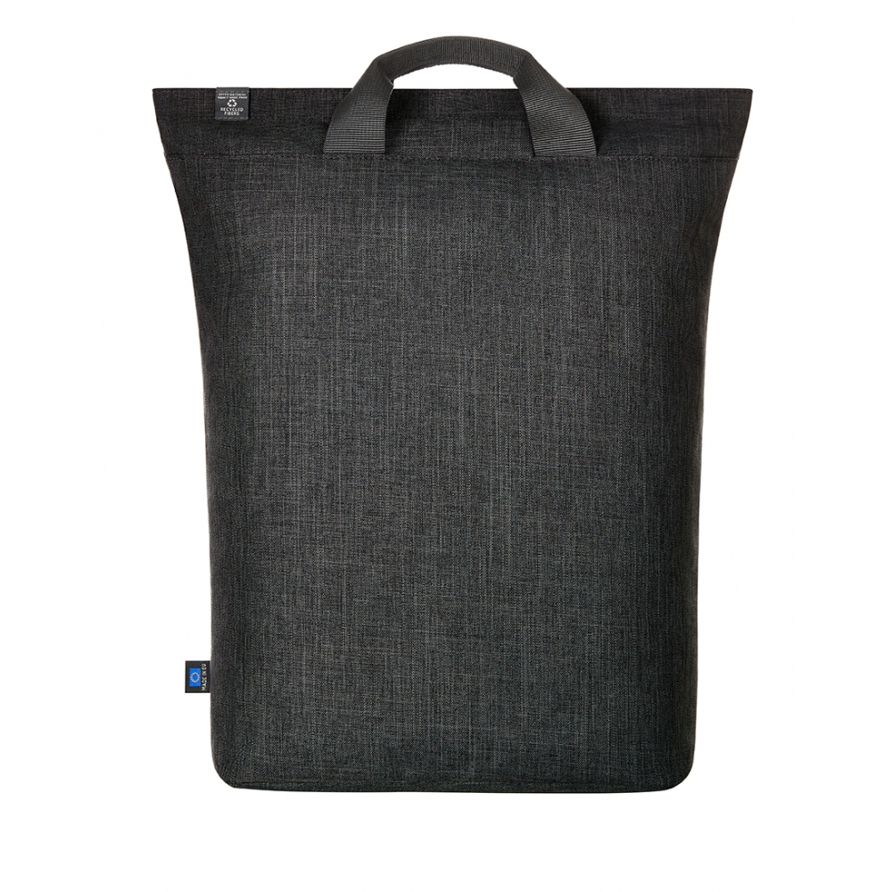 Urbaner Rucksack mit Magnet- und Wickelverschluss; geräumiges Hauptfach mit gepolstertem Notebookfach; rPET Obermaterial; rückseitige Reißverschlusstasche; aufwändig gepolsterter Rücken mit verstecktem Reißverschlussfach; gepolsterter Boden; längenverstellbare gepolsterte Schultergurte mit Gummischlaufen zum Befestigen von z. B. Sonnenbrille; Handgriff