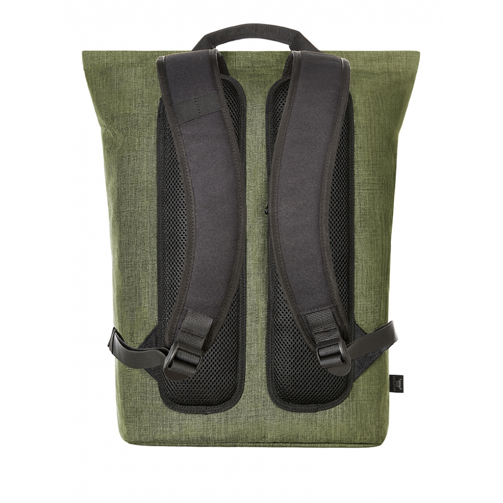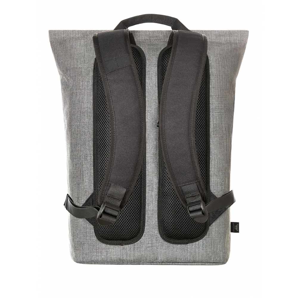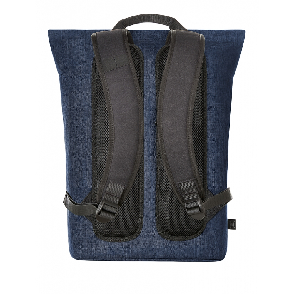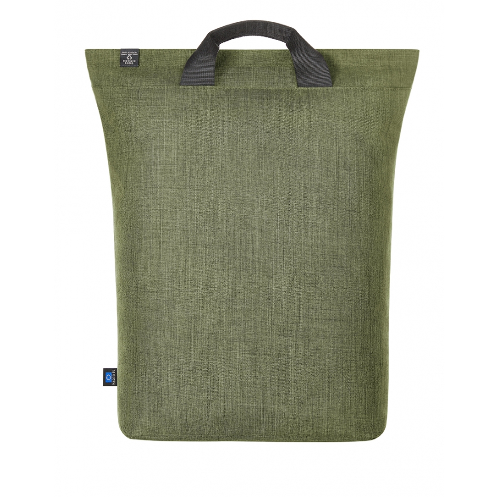 Urbaner Rucksack mit Magnet- und Wickelverschluss; geräumiges Hauptfach mit gepolstertem Notebookfach; rPET Obermaterial; rückseitige Reißverschlusstasche; aufwändig gepolsterter Rücken mit verstecktem Reißverschlussfach; gepolsterter Boden; längenverstellbare gepolsterte Schultergurte mit Gummischlaufen zum Befestigen von z. B. Sonnenbrille; Handgriff