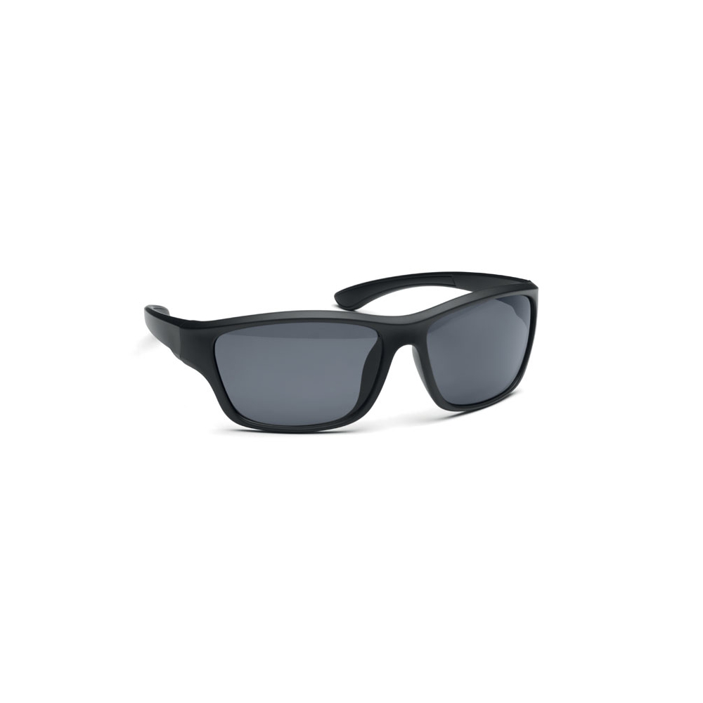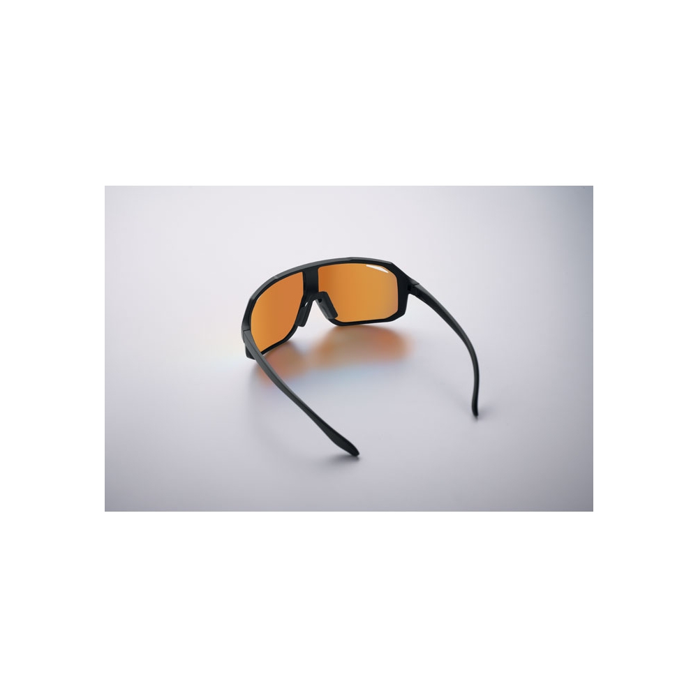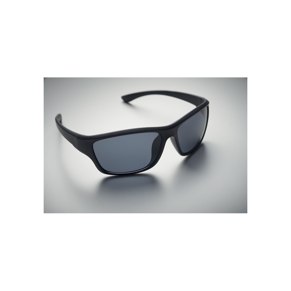 Sportliche Sonnenbrille aus Kunststoff mit verstellbaren Gummispitzen und UV-400 Schutz Kat. 3 Verdunkelung. Entspricht EN1836-2005 und den EEC-Normen. Angeboten in einem weichen Etui. Maße: 15,2 x 4,5 x 5,8 cm (zusammengeklappt), Werbefläche: 100 x 50 mm (Etui), Material: Kunststoff