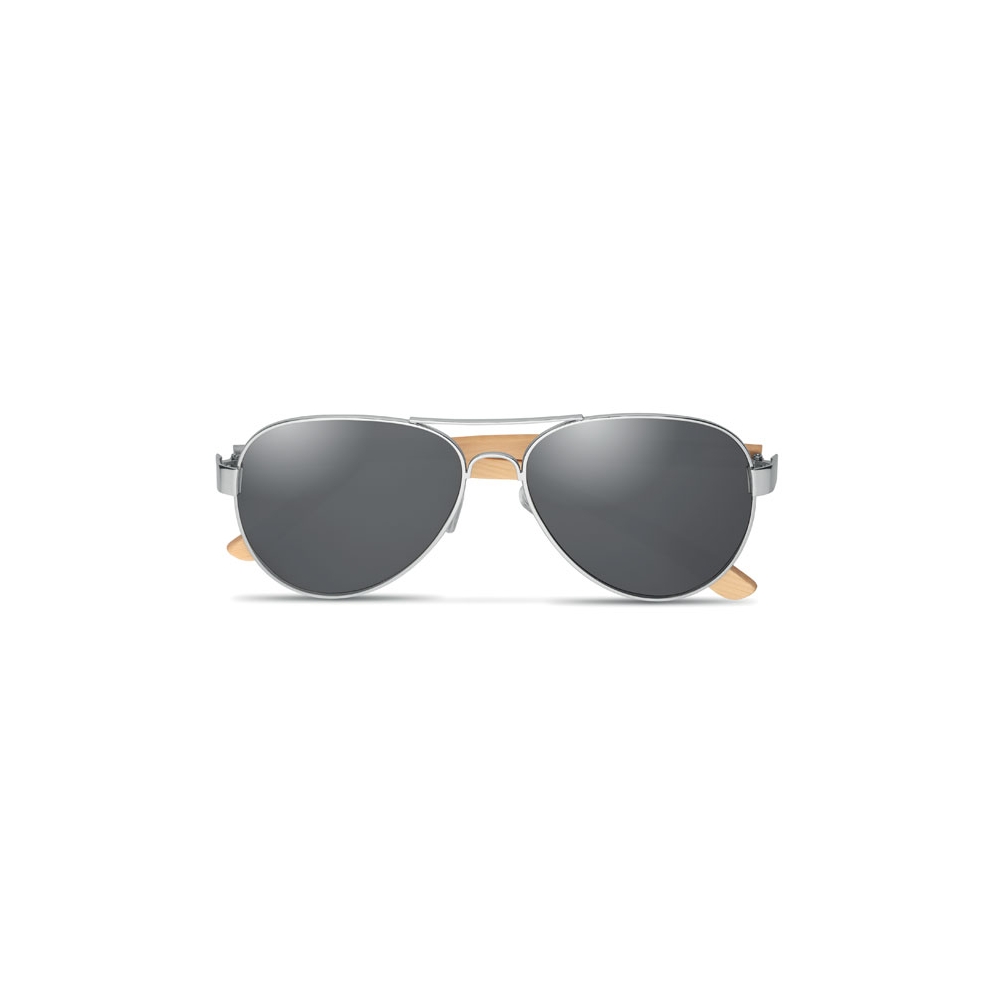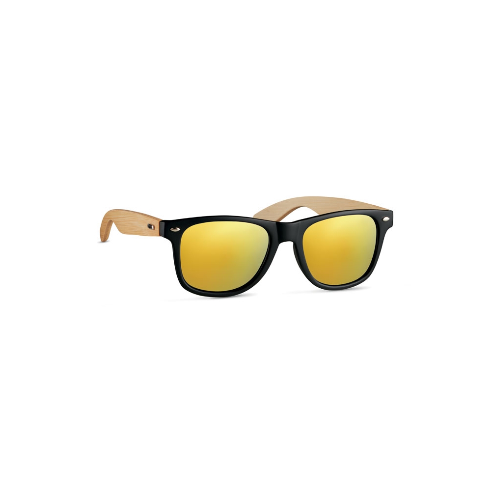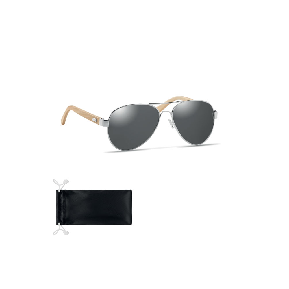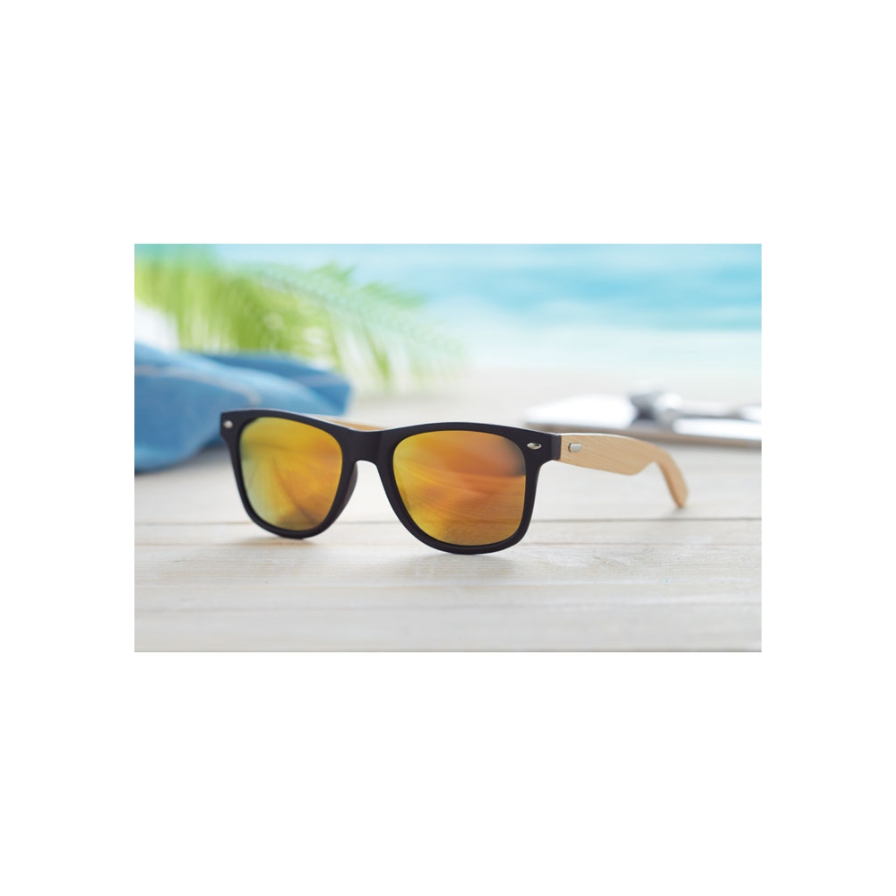 Bambus-Sonnenbrille mit UV400-Schutz. Farbiger Rahmen aus haltbarem PC-Material und Bambusbügel. Verspiegelte AC-Gläser (Celluloseacetat), erhältlich in verschiedenen Farben. Präsentiert in einer attraktiven Kraftpapiertasche. Materialien wie Bambus fördern die Verwendung von natürlichen Rohstoffen und reduzieren die Schadstoffemissionen. Es handelt sich um eine sehr widerstandsfähige und vielseitige Pflanze, die schnell wächst und sich regeneriert, was sie zu einer hervorragenden Alternative zu herkömmlichem Holz macht.