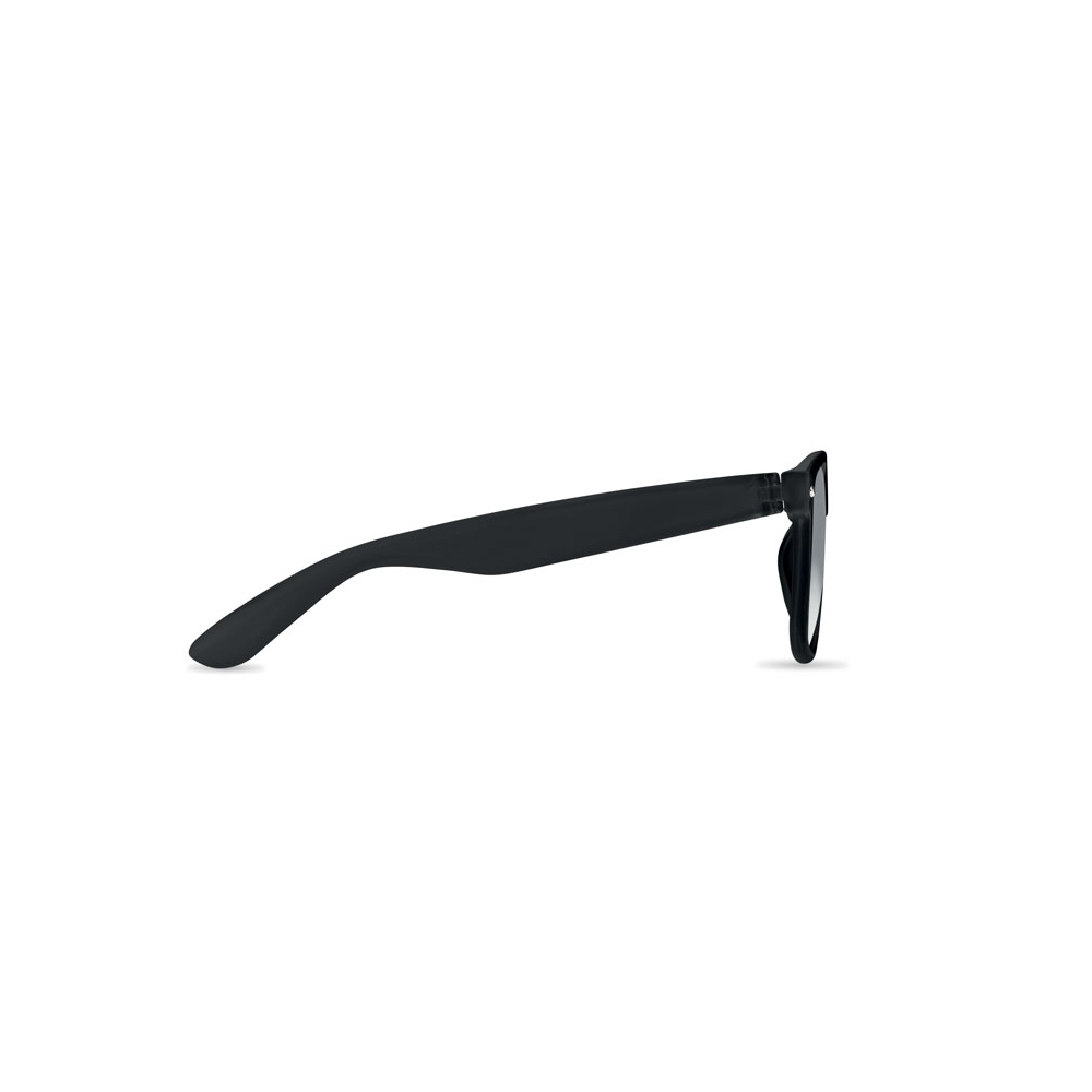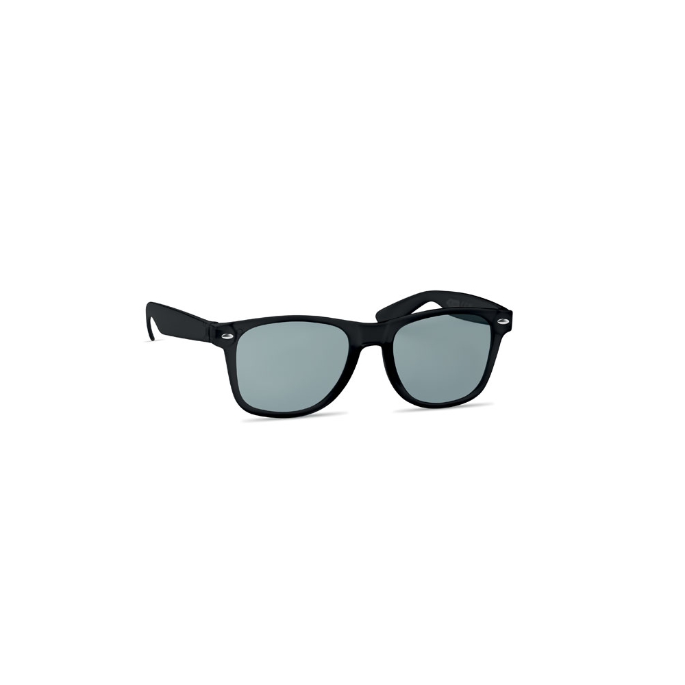 Sonnenbrille mit schwarzem Kunststoffrahmen und farbigen Gläsern, die natürlich UV 400 Schutz der Filterkategorie 3 haben. Ihre Werbung wird außen auf einen Bügel gedruckt.