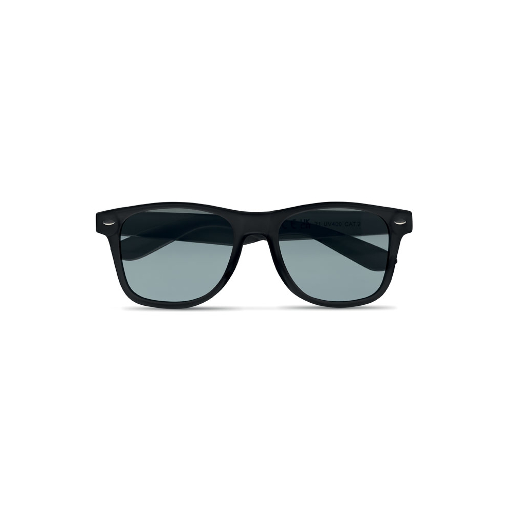 Diese nachhaltige Sonnenbrille im Retro-Design ist der ideale Werbeartikel für Sommerfestivals, Veranstaltungen oder andere sonnige Aktivitäten im Freien. Dank des recycelten PET-Kunststoffs ist die Sonnenbrille leicht und angenehm zu tragen. Diese Brille entspricht der Norm EN ISO 12312-1, hat UV400-Gläser der Kategorie 3 und ist somit die perfekte Wahl für den Schutz vor hellem Sonnenlicht.