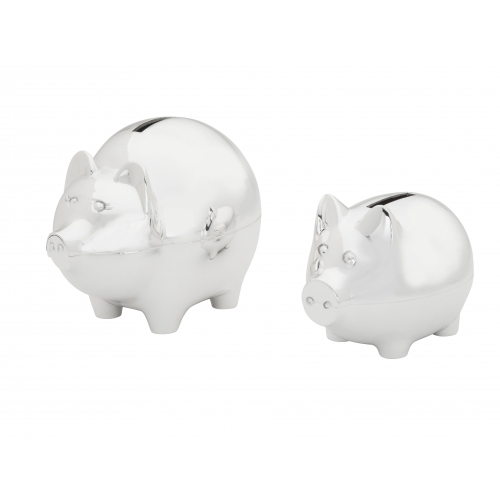 Hübsches Sparschwein mit der Silhouette eines kleinen Schweins, das Design und Funktionalität vereint und das Sparen zu einem freudigen Erlebnis macht, indem man durch das Methacrylat-Fenster beobachtet, wie die Ersparnisse steigen. Einzeln präsentiert in einer Kraft-Design-Box.