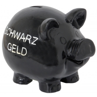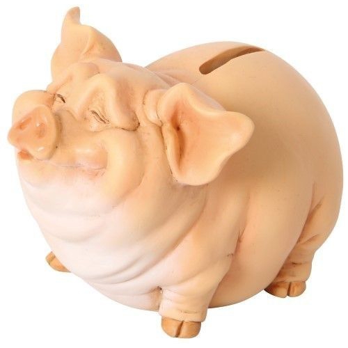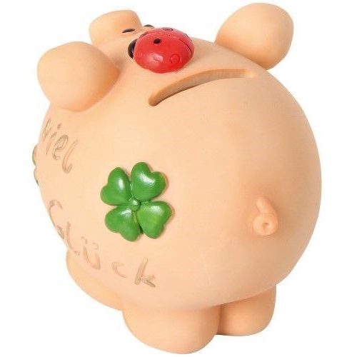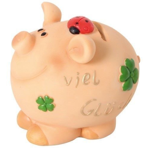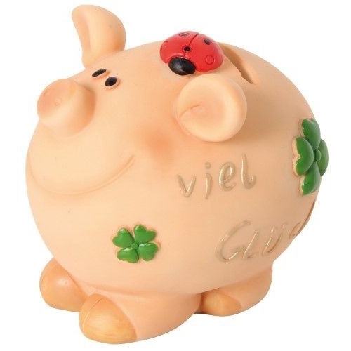 Lustige Glücksschwein-Spardose aus Polyresin mit Glückskäfer und goldfarbener Aufschrift: Viel Glück. Wiederverschließbar nach Entleerung durch Plastikverschluß.