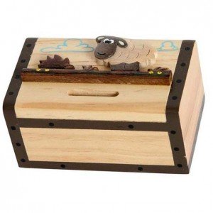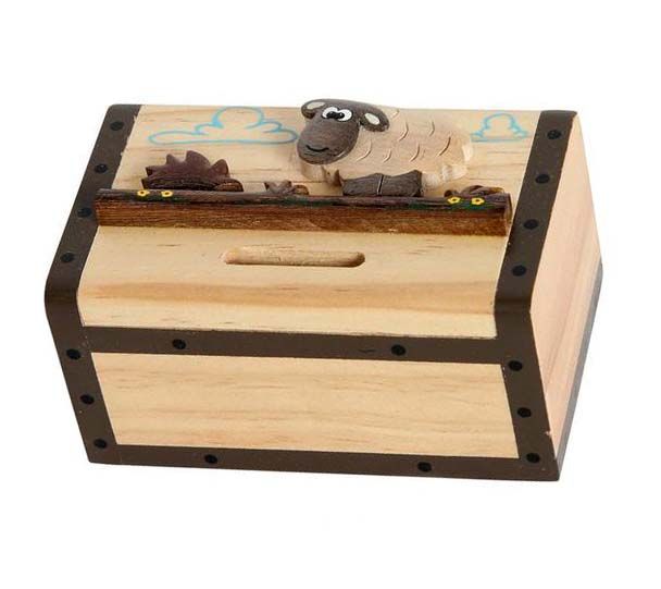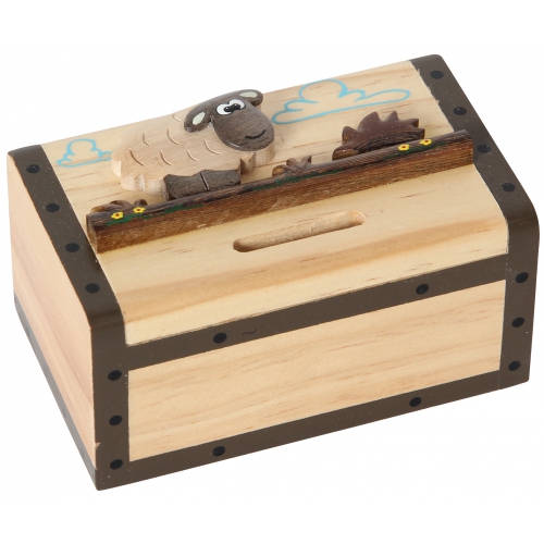 Diese hochwertige Holzspardose im Schafdesign lässt sich nur mit einem Trick öffnen. Durch Verschieben des Motivs öffnet sich die Dose. (Für Kinder unter 3 Jahren nicht geeignet.) Schafmotiv auf der Dose liebevoll handbemalt. Größe: ca. 105 x 65 x 55 mm Material: Holz