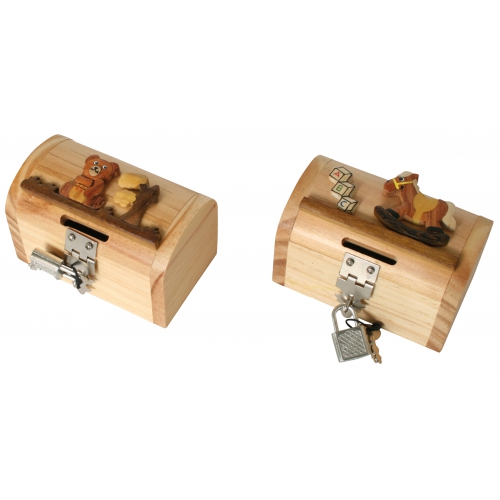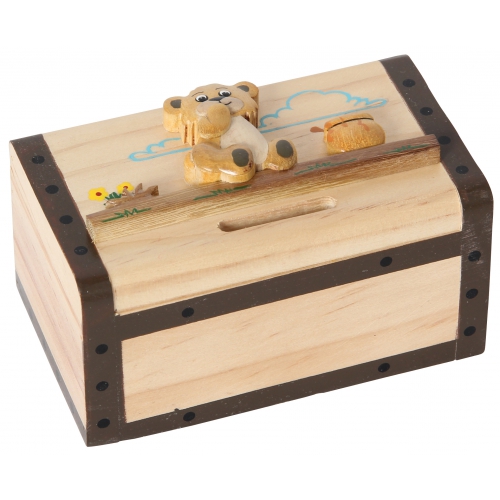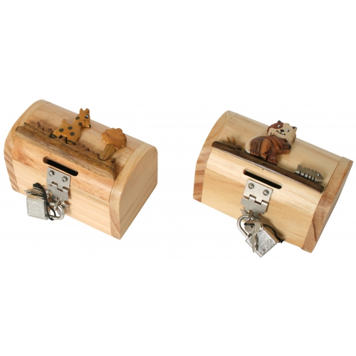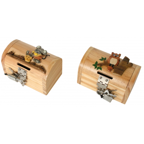 Sparen aus Naturholz mit Tierdesign. Enthält Farbstifte, die es ermöglichen, das Design jeder Sparkasse zu personalisieren. Enthält ein praktisches unteres Loch für einen einfachen Zugang zu den Ersparnissen, ohne sie zerbrechen zu müssen.
