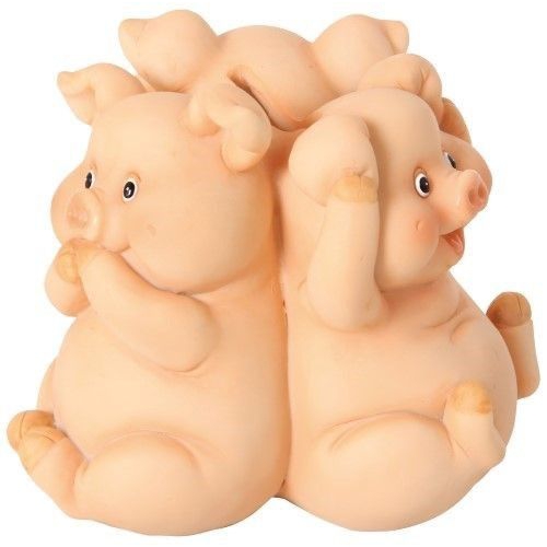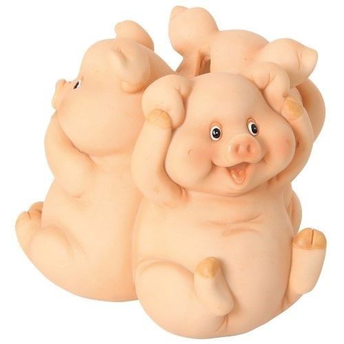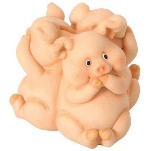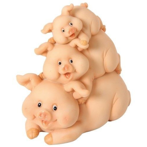 Attraktive und lustige Spardose aus Polyresin mit drei glücklichen Schweinchen auf einem Haufen. Wiederverschließbar nach Entleerung durch Plastikverschluß.