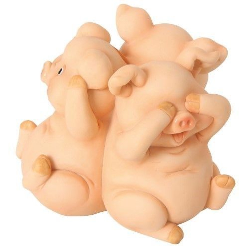 Diese Schweinchen-Spardose aus Polyresin mit rosiger Oberfläche veranschaulicht die drei typischen Verhaltensweisen: Nicht sehen, Nicht hören und Nicht sprechen. Wiederverschließbar nach Entleerung durch Plastikverschluß.