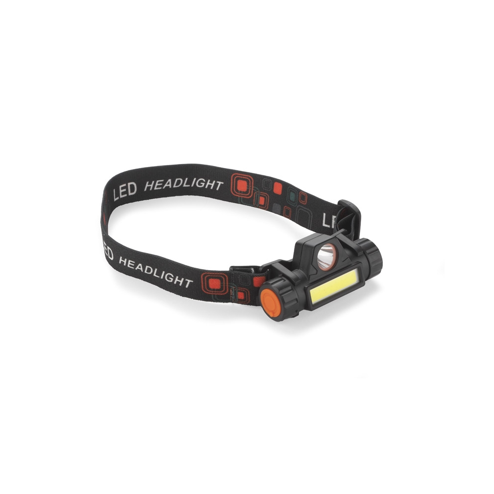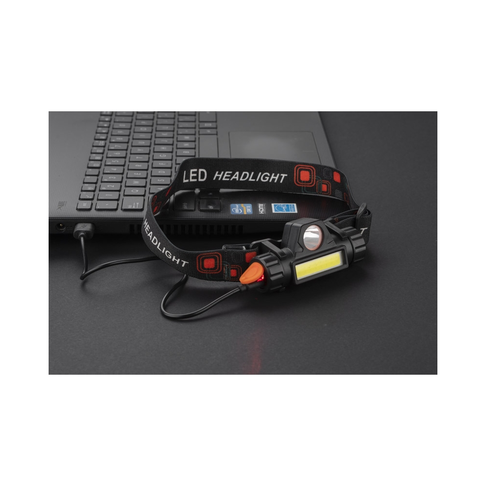 Artikel-Nr: OCBMO2428-03Wiederaufladbare, verstellbare Stirnlampe. 1 LED-Lampe (50 Lumen) und 3 Leuchtstufen. Eingebauter Akku: 400 mAh. Inkl. Ladekabel. ABS.