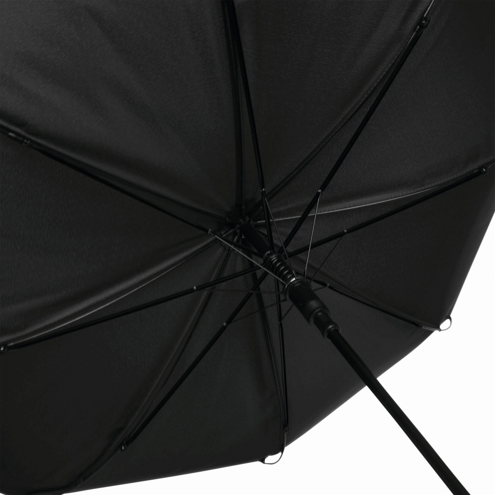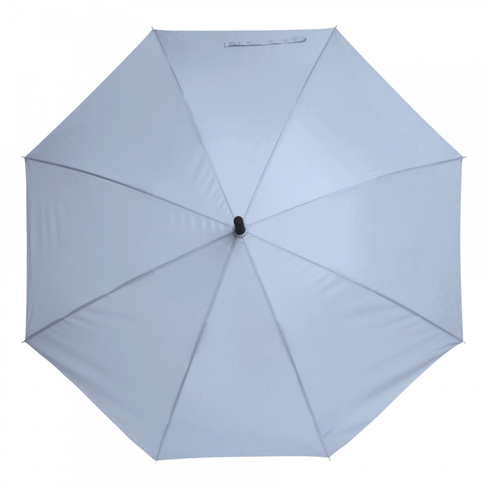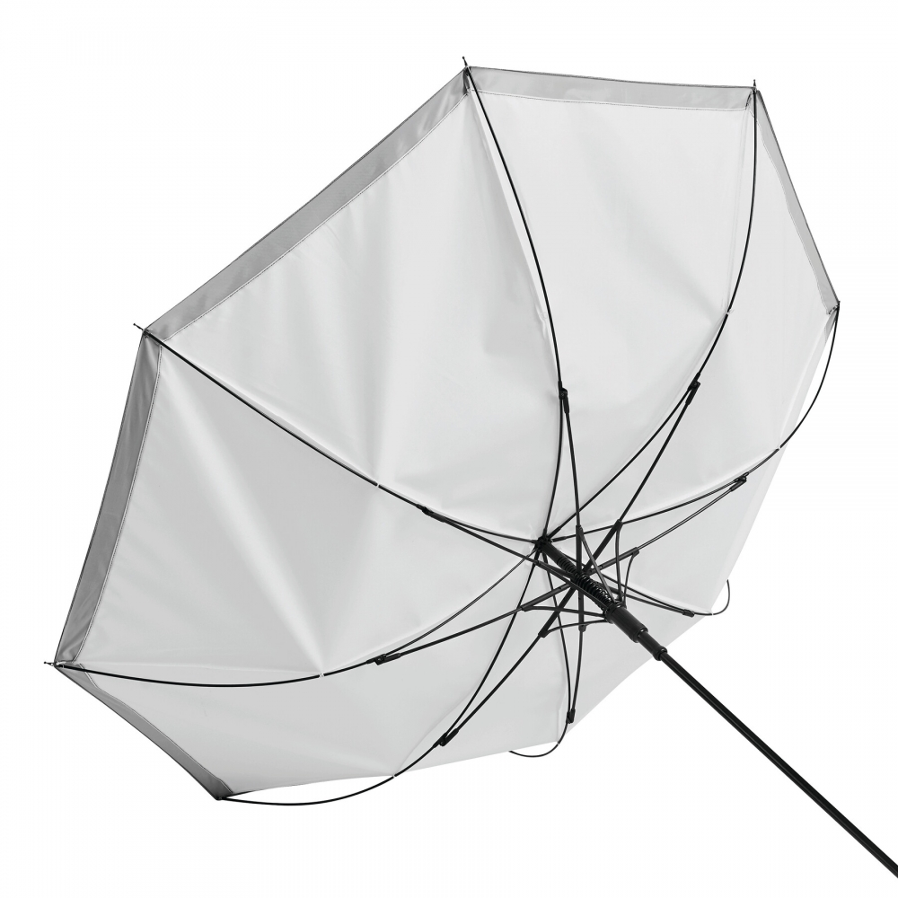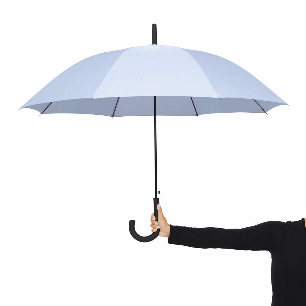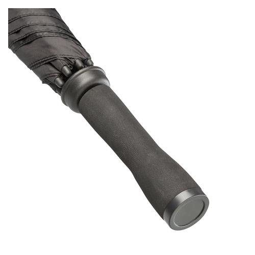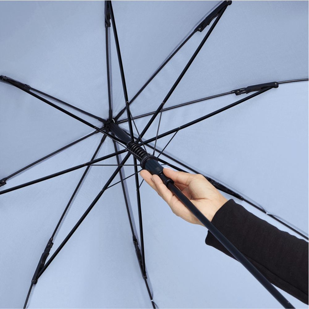 Großer Regenschirm mit winddichtem Fiberglasgestell. Der pfiffige Farbeffekt zwischen der Pongee-Polyesterkappe und dem ergonomischen Griff verleiht dem Schirm einen zeitlosen Look. Damit ist er für jeden geeignet.